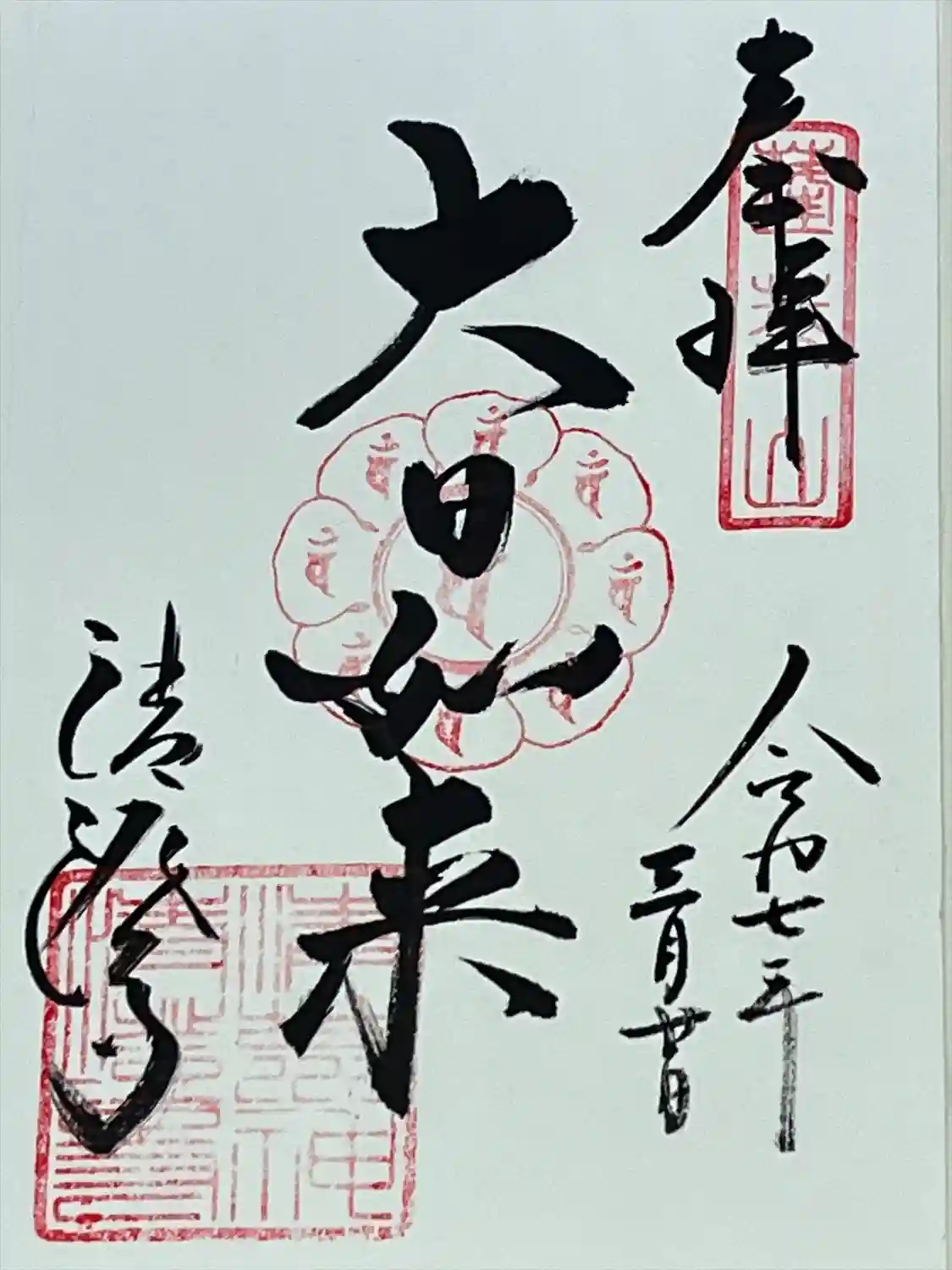 清荒神清澄寺の御朱印には、御本尊「大日如来」、守護神「清荒神王」、荒神様の御眷属「布袋尊」の御名が書かれ、御宝印が押されています。