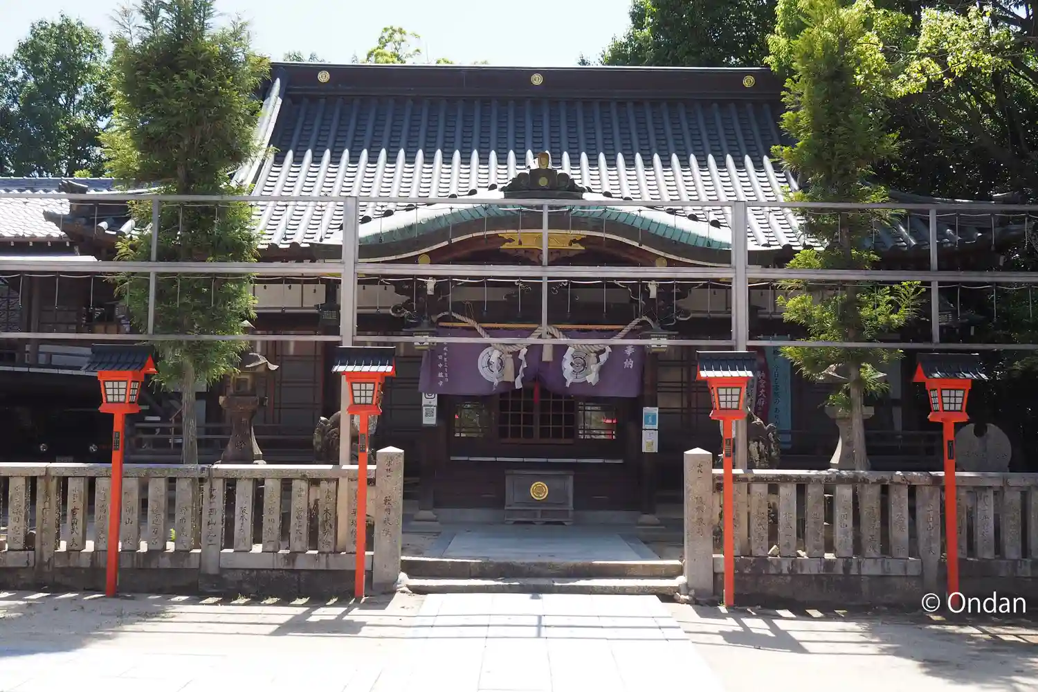宝塚市の高台に鎮座する神社で、参道を阪急電鉄今津線が横切っています。