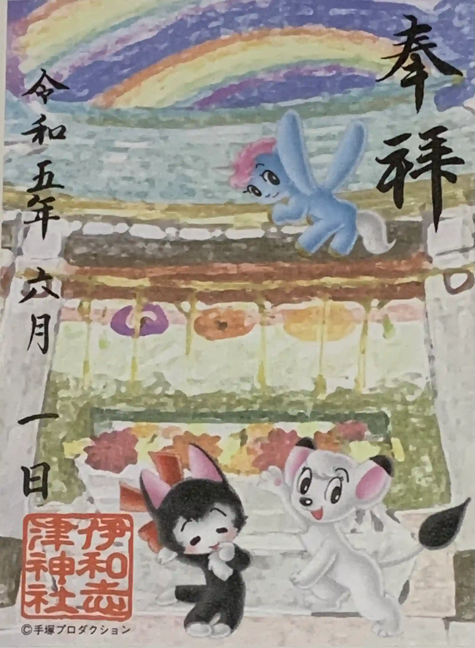 御朱印の手塚治虫氏のマンガキャラ、ユニコとレオかな?あと黒い子に覚えがないのですがとても可愛いです。