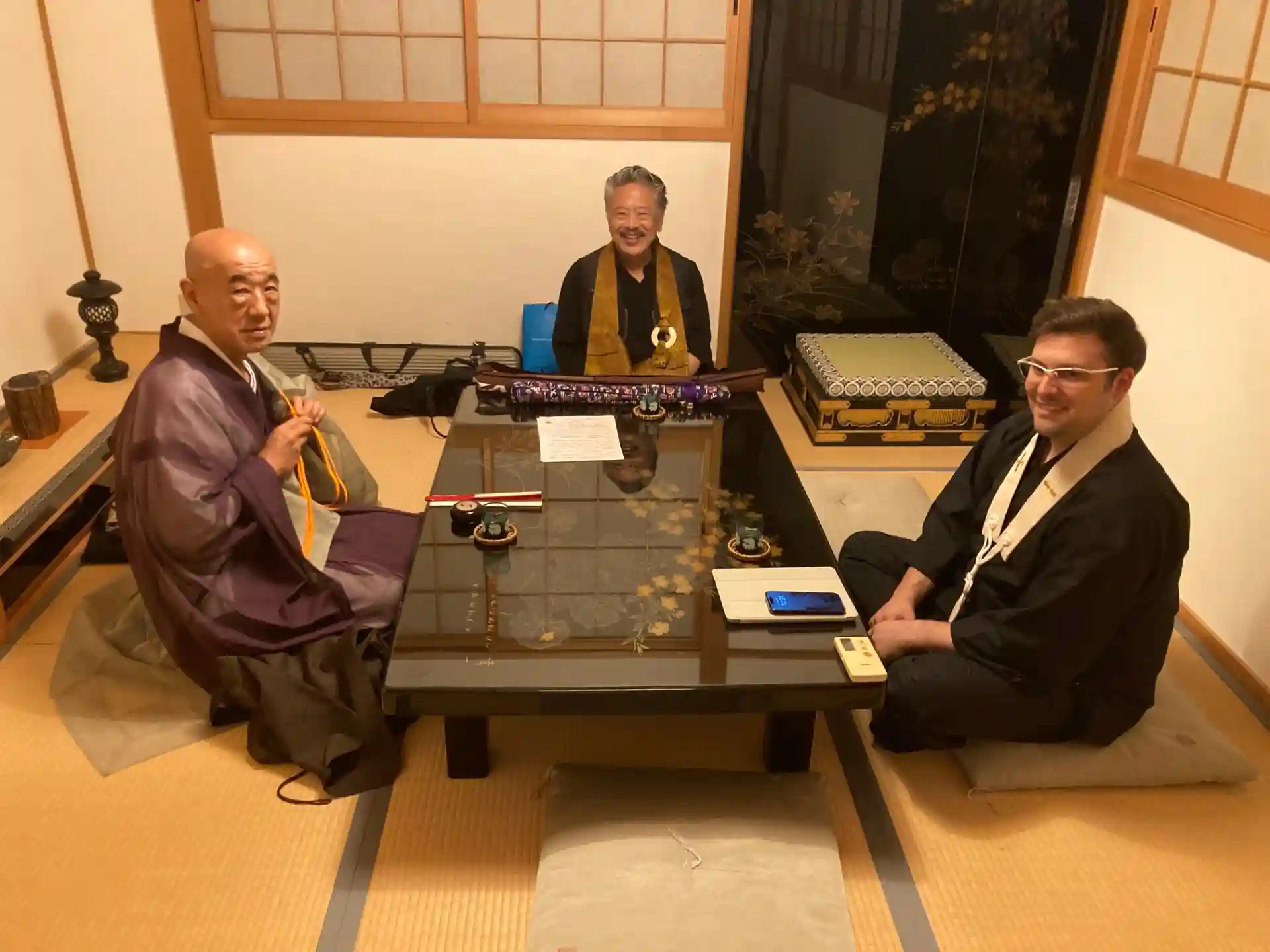 控え室の、明暗寺ご住職、大阪芸術大学教授・志村先生、ショーン名誉大師範