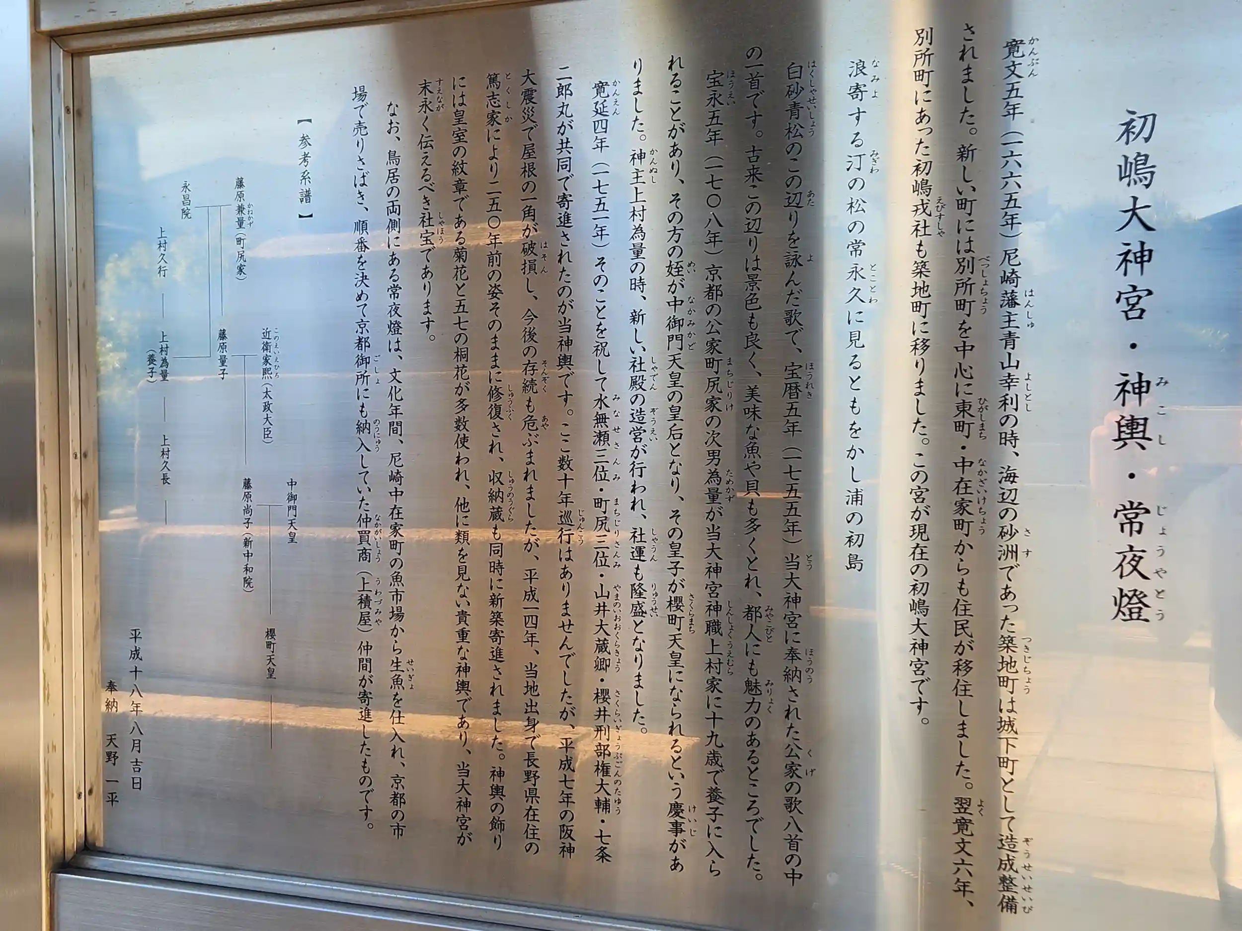 宝永5年(1708)には、中納言藤原兼量の子孫である為量(大隅守正若)が社家上村家の養子に入られ姪御にあたる藤原尚子(新中和門院)が、中御門天皇の皇后となられました。