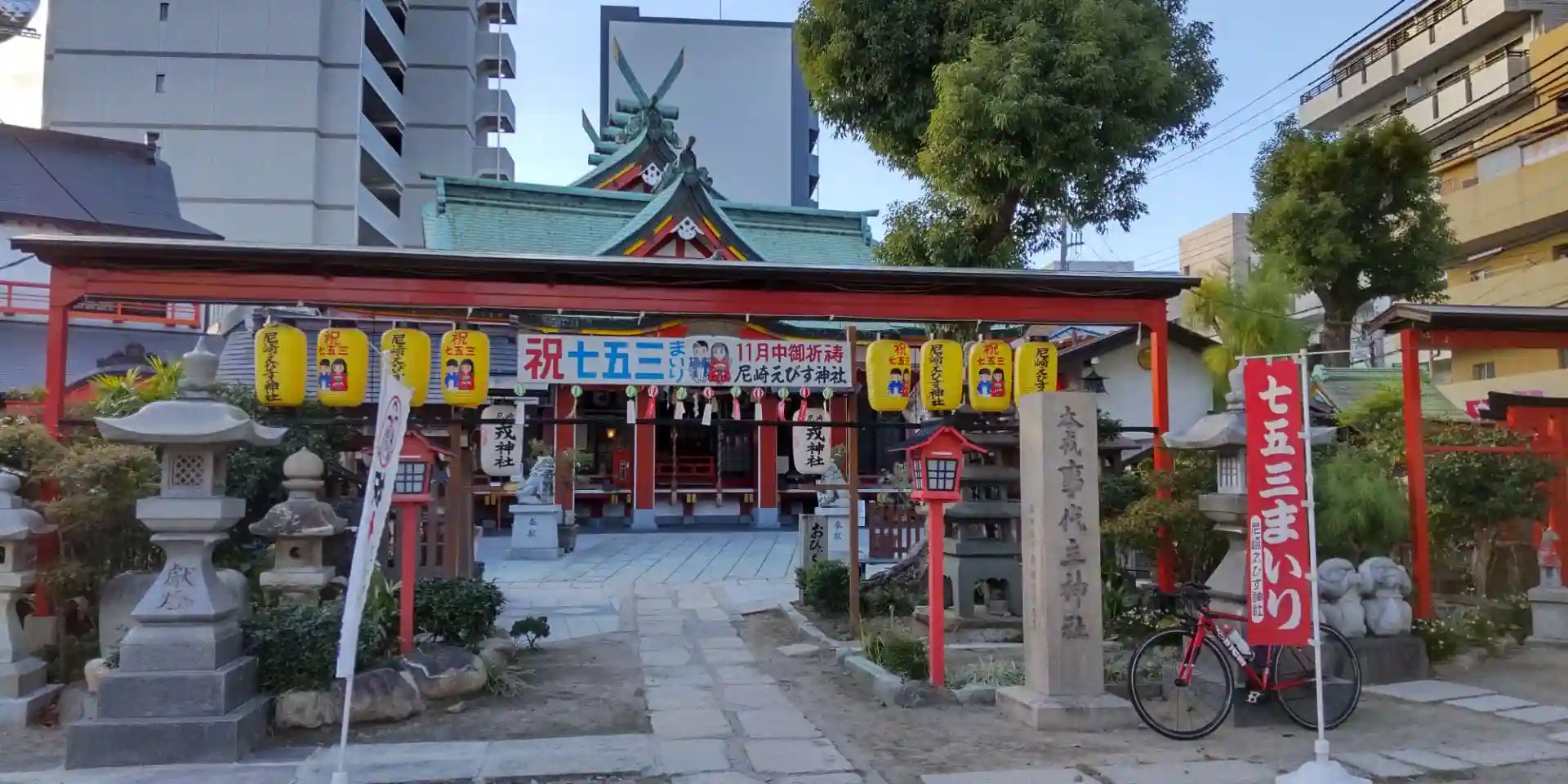 赤い大きな鳥居が見え、向かうとこちらのえべっさんでした。えびすさまのお顔がふくよかでとてもほんわかします。境内には見どころ的なものがたくさんあってワンダーランドです!こちらでは月替りの御朱印をいただけるようです!すぐ側に大きく賑やかな商店街があって、阪神尼崎駅のすぐ側ということもあって、阪神の応援幕が吊るされていました。熱いあまです!