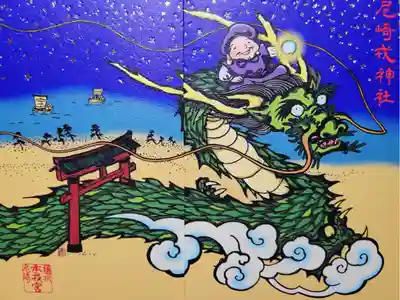 真ん中の上部に注連縄に座った大黒天が描かれ、下部に拝殿をバックに「尼」の文字が入った扇を掲げるえびす様が描かれています。