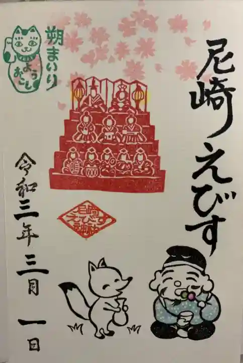台紙の上部に桜が咲き、お雛様が飾られ、ひし形の中に「尼崎えびす神社」の名前が入った印が押され、えびす様ときつねがひな祭りを楽しんでいる様子が描かれています。