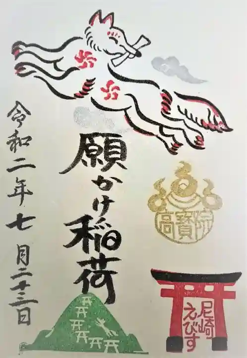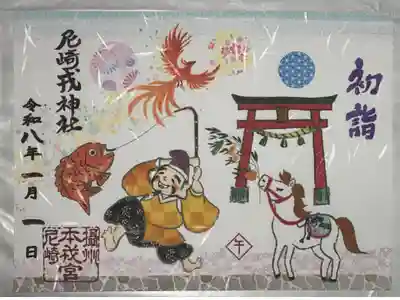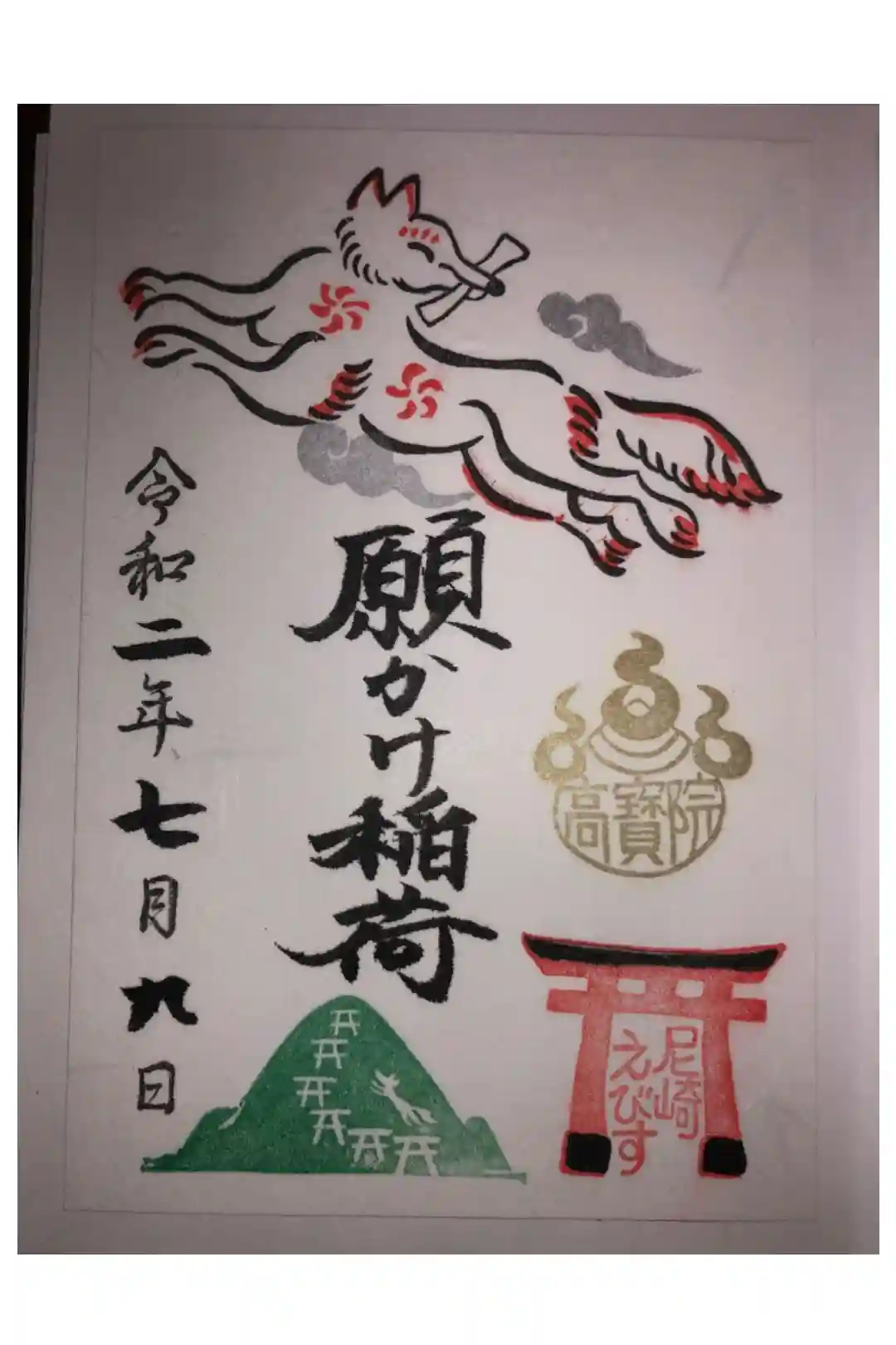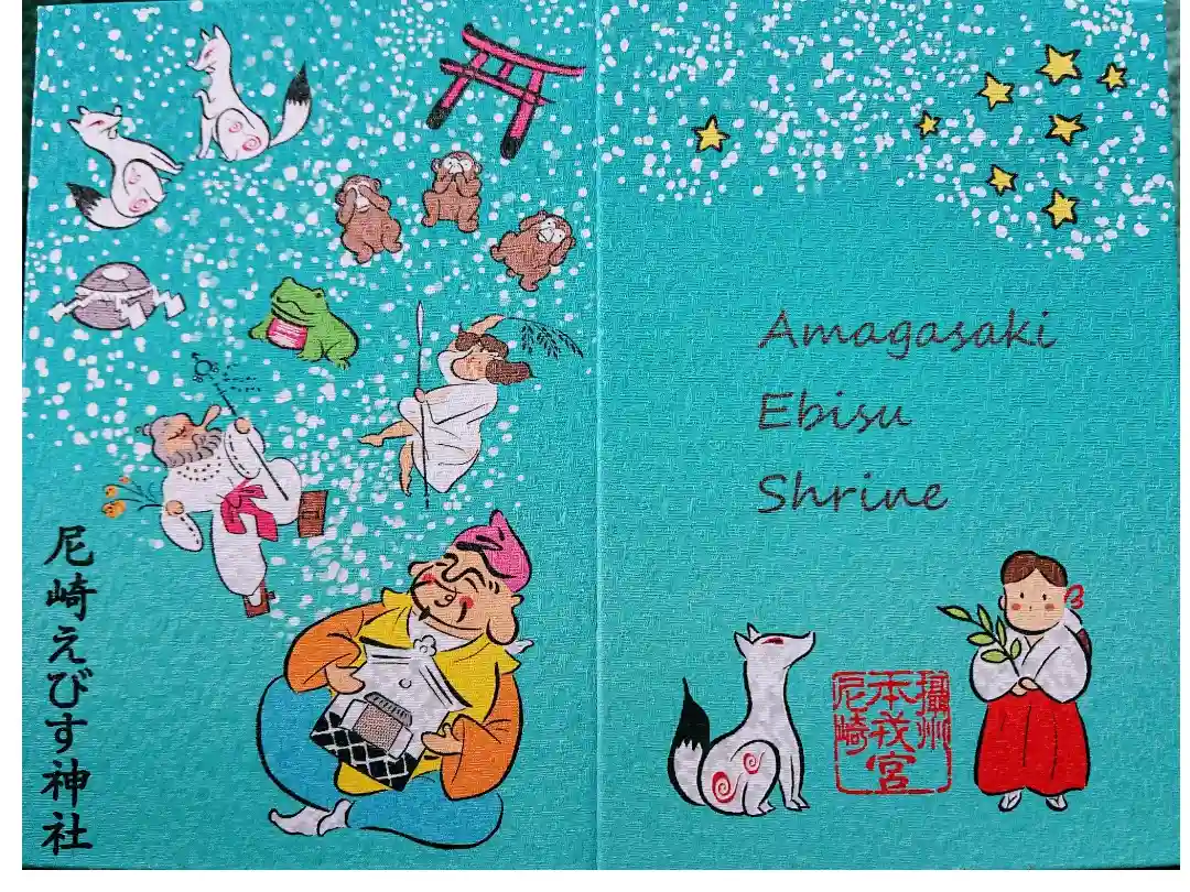 台紙の上部に文をくわえた御神使の狐が空を舞い、下部には「尼崎えびす」の文字が入った鳥居の絵と山の絵が描かれています。