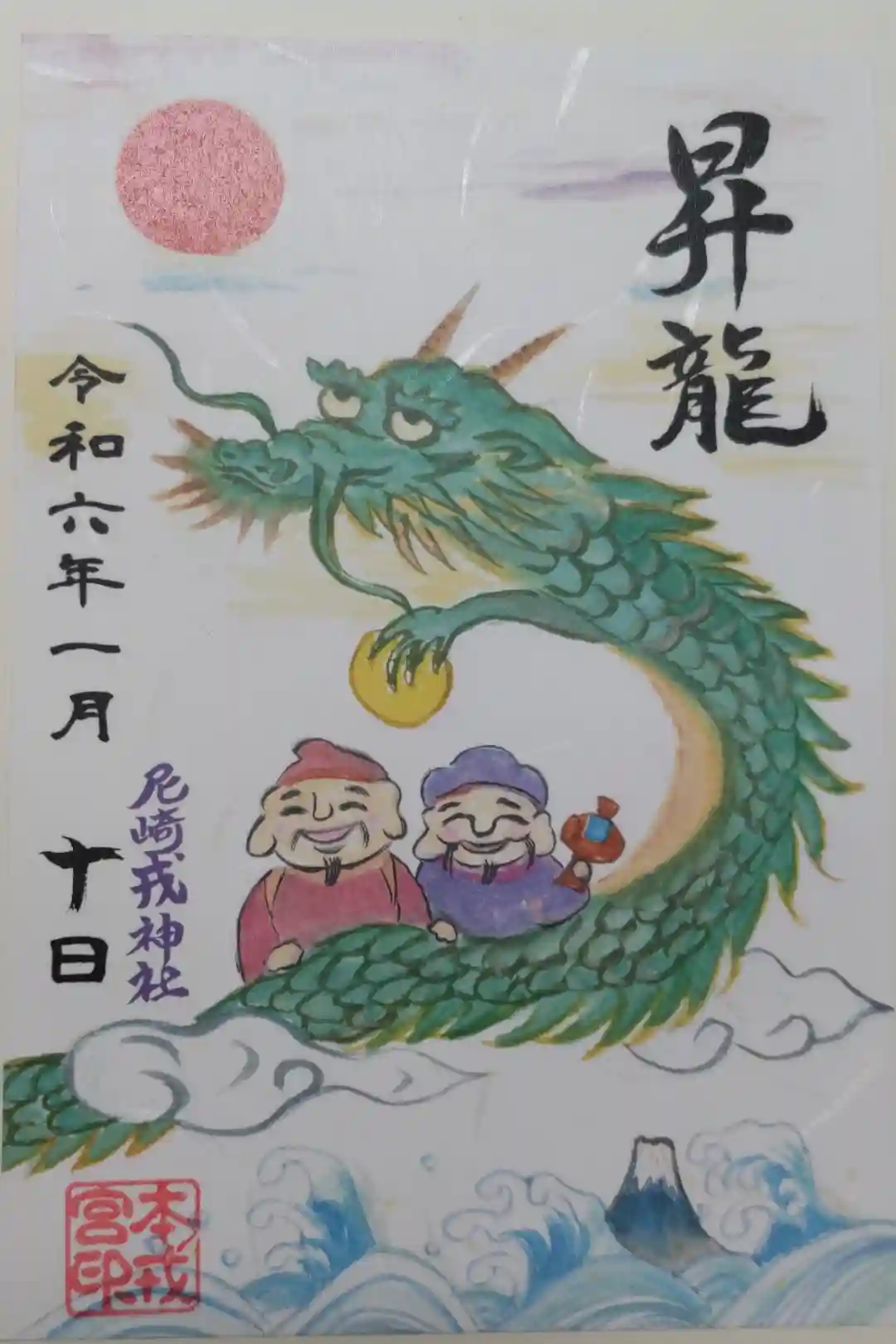 令和6年正月の御朱印。恵比寿大黒の乗る昇龍、初日の出、富士山の絵柄です。
