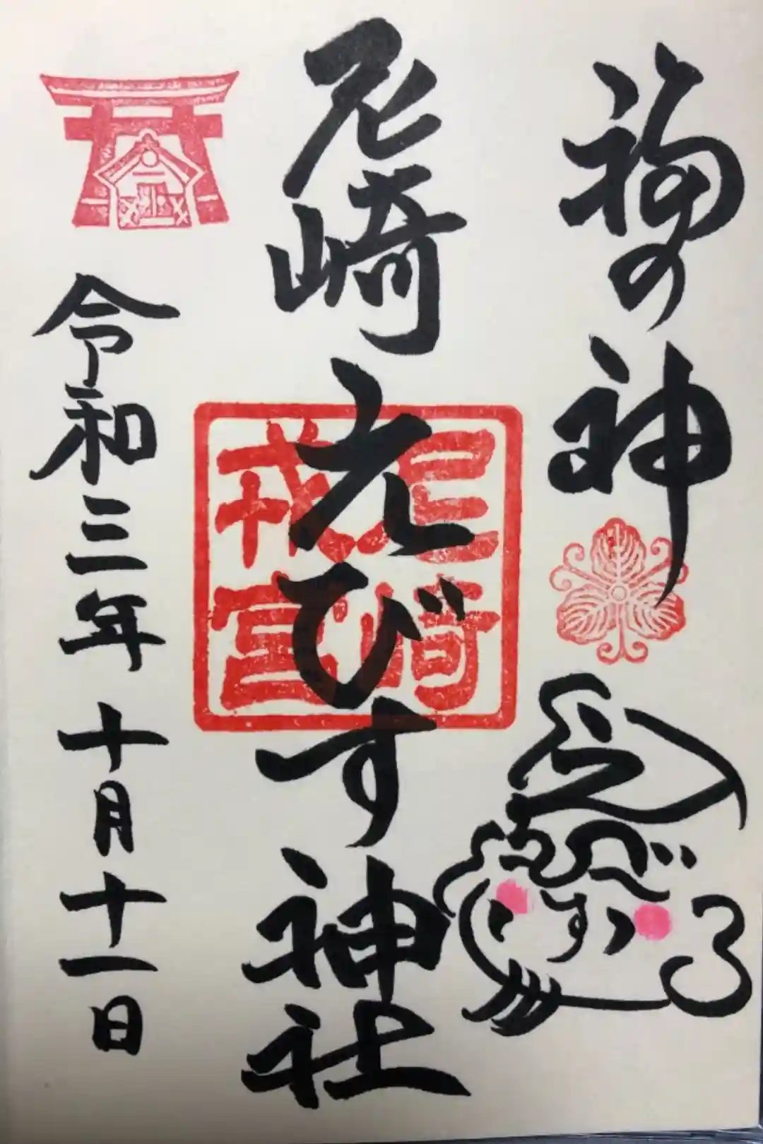 町中に突然出てくる大きな鳥居が目印です。月替わりの御朱印をいただきました。