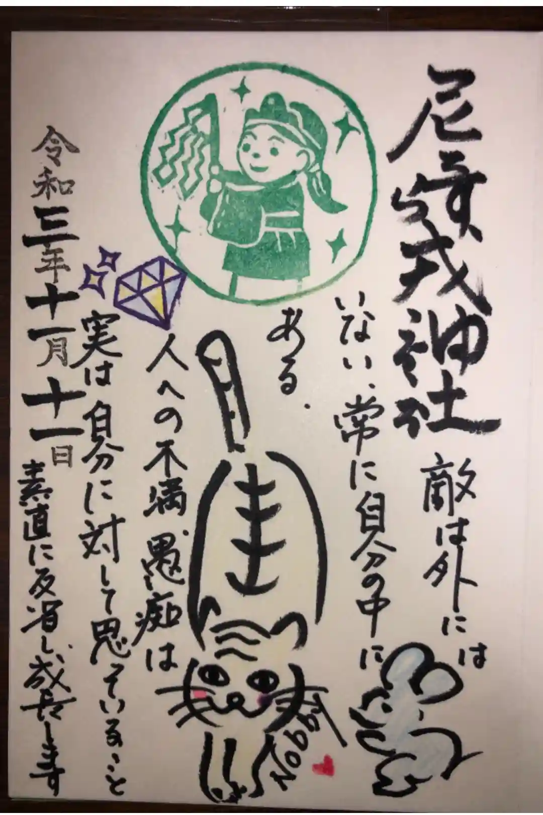 宮司さんに直書きして頂いた絵心無し御朱印です。その人を見て浮かび上がった言葉を書いて頂けます。