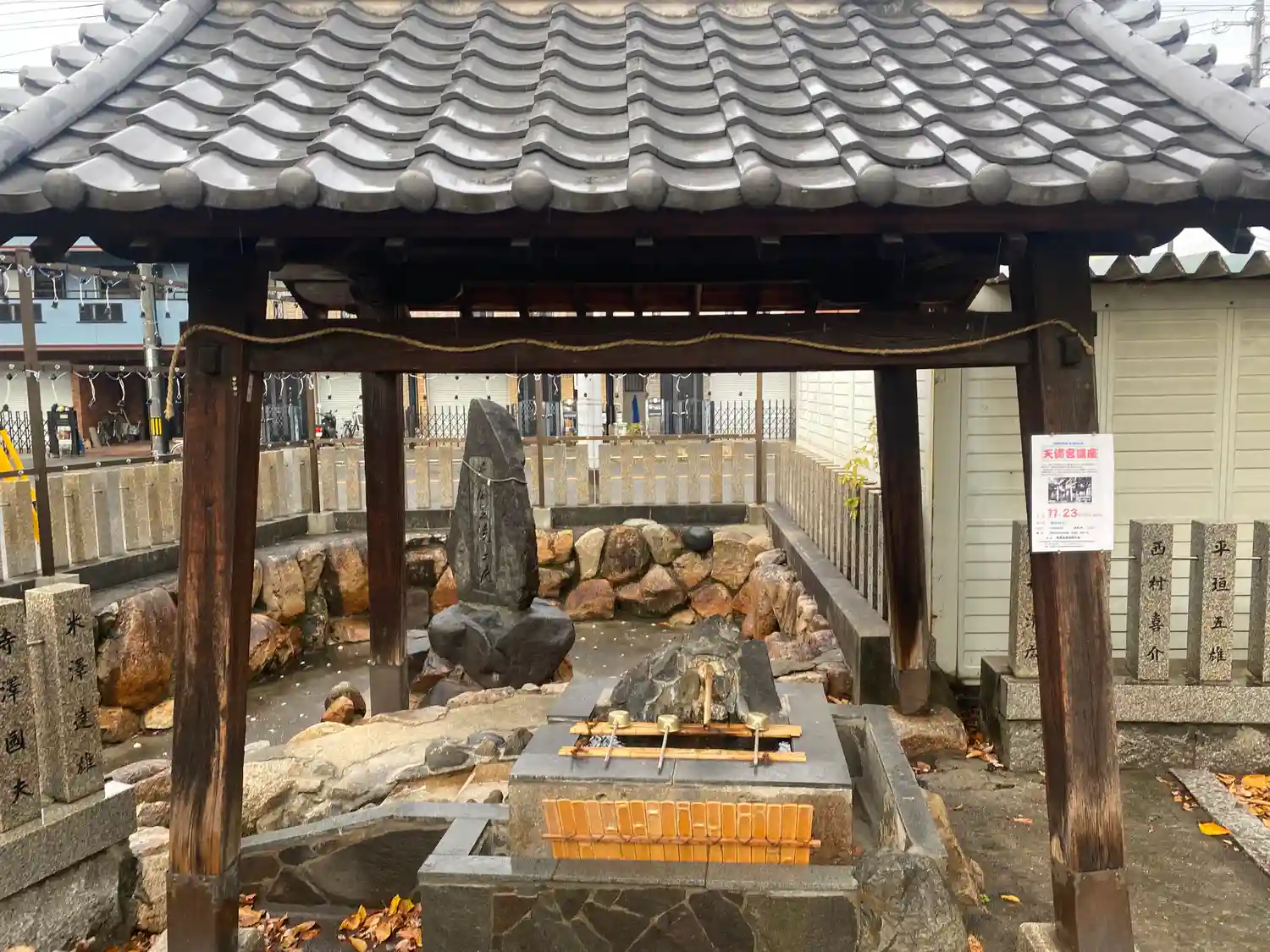 菅原道真公が太宰府へ左遷される際、砂で汚れた足の道真公をみかねて老婆が池の水で洗い清めたそうです。 その池は手水の背後にあり、御神池として大切に保存されてきたそうです。