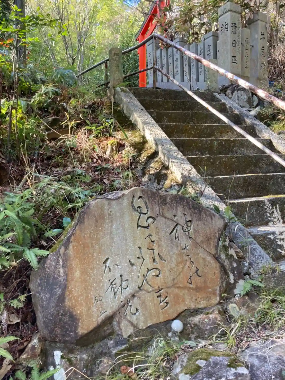 中央の石は、当村山の約2万年前の地層より出土した石で、「村の守り石」として鎮座給う。