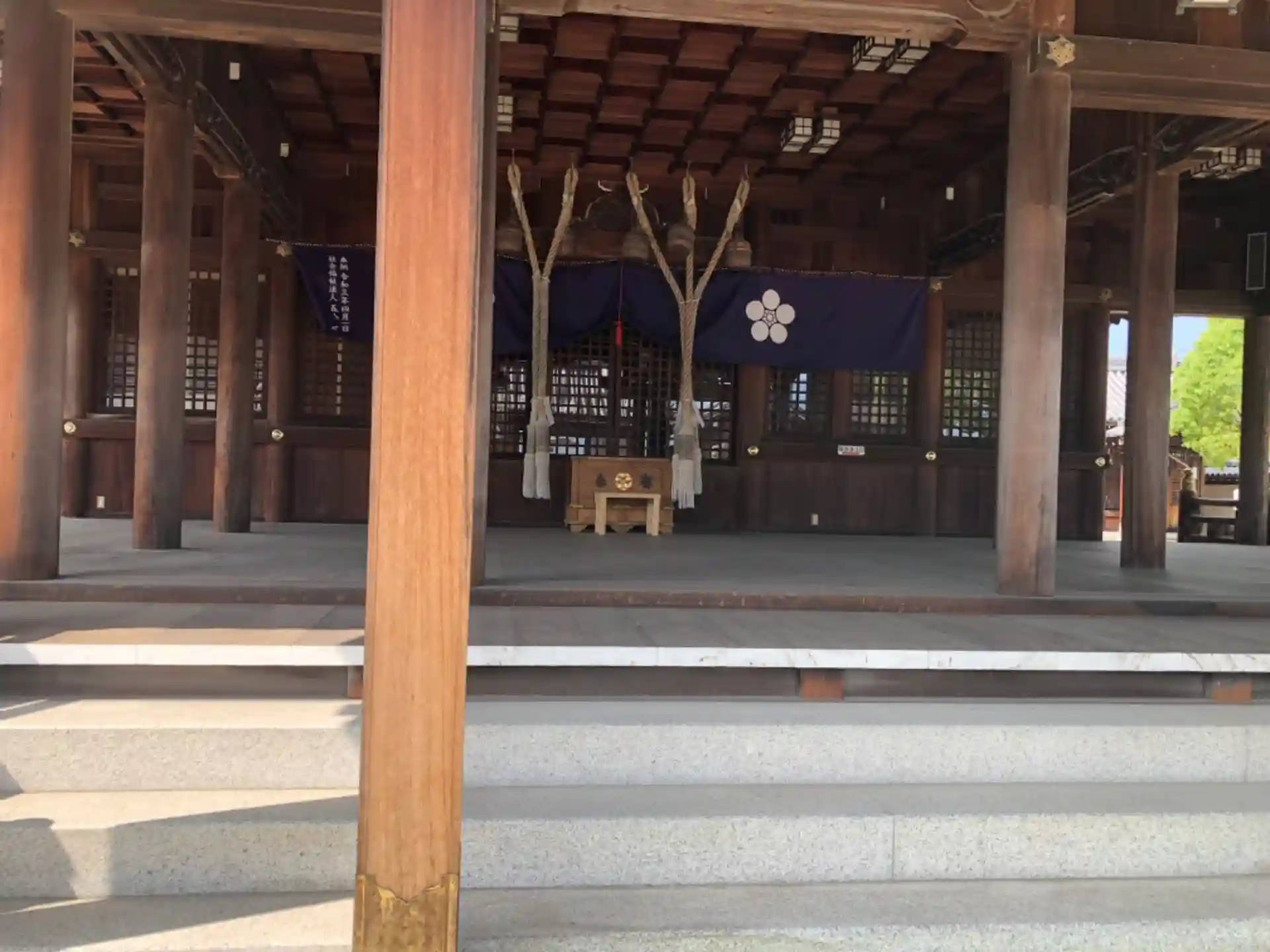 拝殿がかなり広く、たくさんの柱で支えられています。社務所だけでなく、社殿も宮殿の広間のような感じでかっこいい。