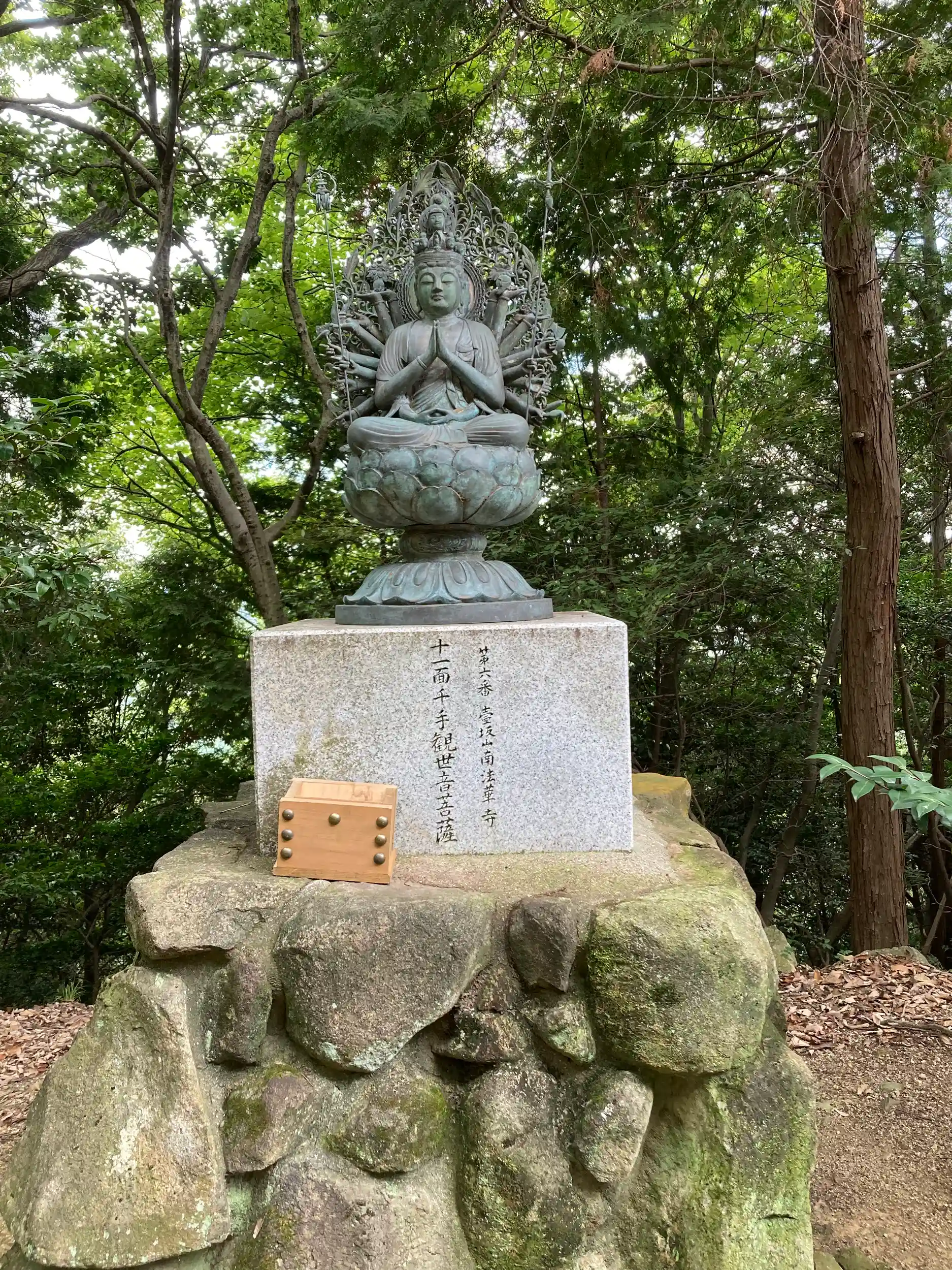 ロープウェイは乗ったらあっという間に着きます。山頂駅からは徒歩で向かいましたが、徒歩20分ほどのなだらかな登り坂。途中西国三十三か所の仏像が山道沿いにあり迎えていただけます。