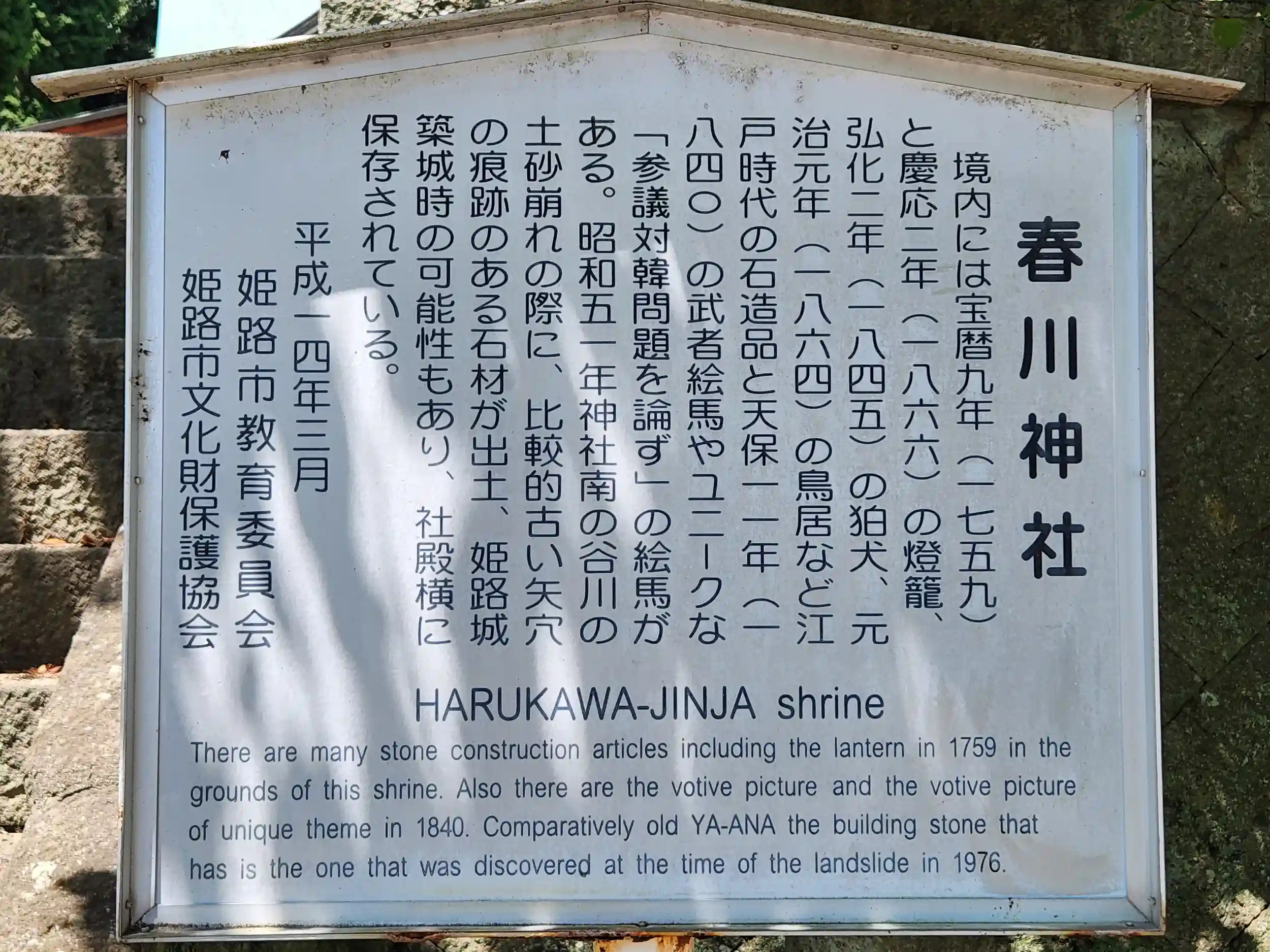 昭和49年(1974)、社殿の改修が行われ、鉄骨造り銅板葺の近代社殿が完成した。同年参議院議員金井元彦氏揮毫の記念碑が拝殿前広場に建立された。昭和51年(1976)神社南の谷川の土砂崩れの際に比較的古い矢穴の痕跡のある石材が出土し、姫路城築城時のものの可能性あり、社殿横に保管されている。