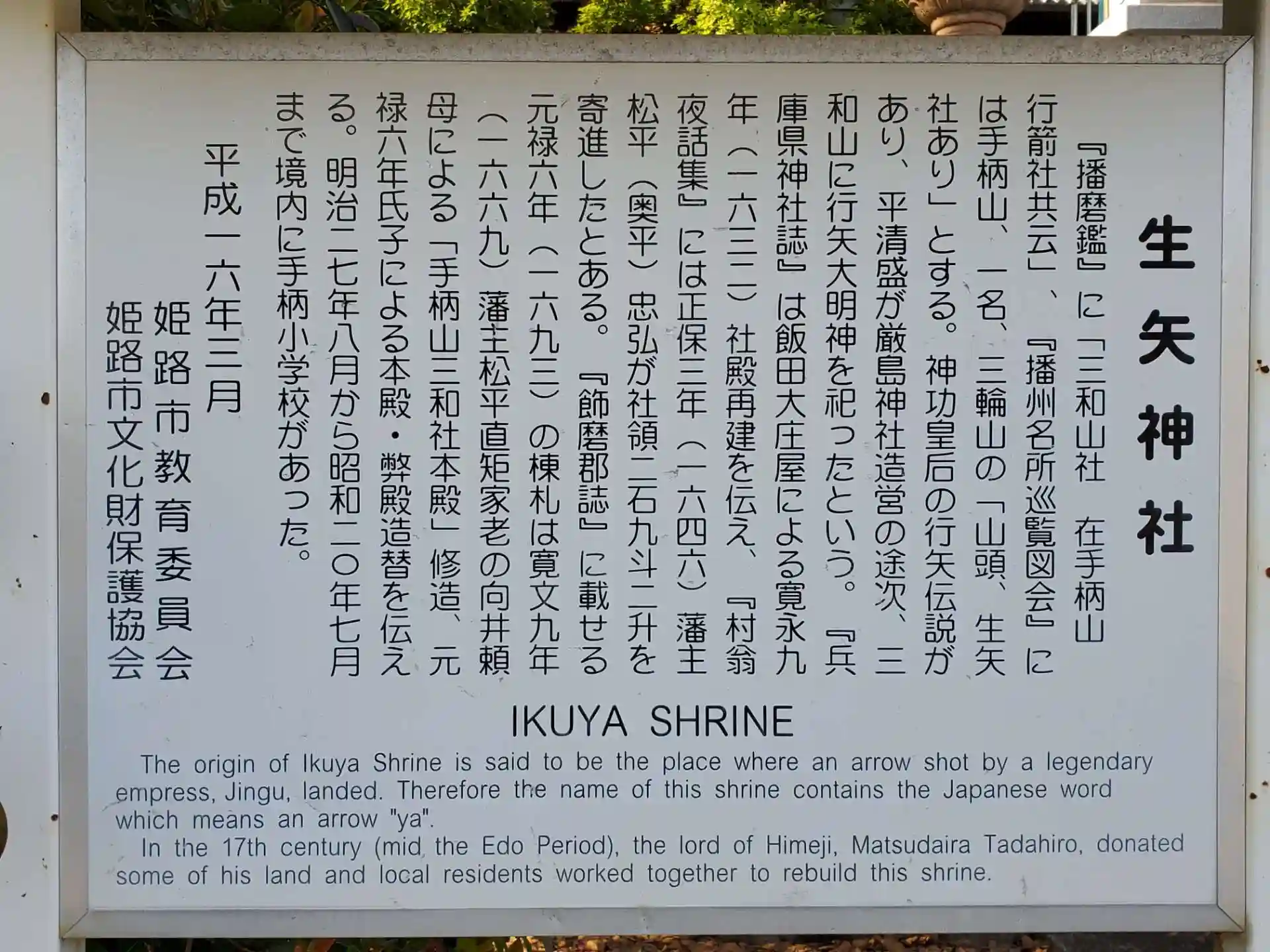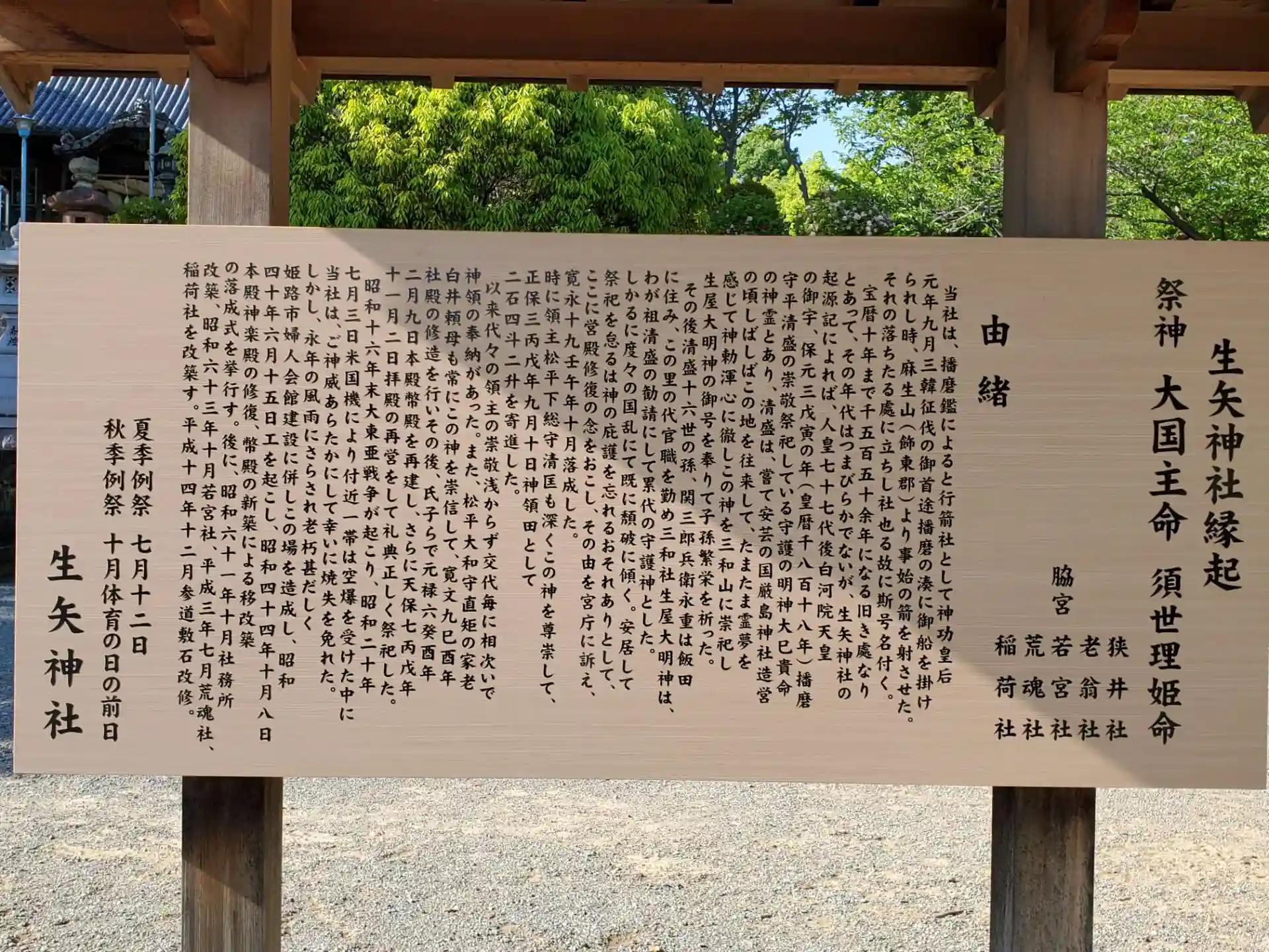 「当社は、播磨鑑によると行箭社として神功皇后元年九月三韓征伐の御首途播磨の湊に御船を掛けられし時、麻生山(飾東郡)より事始の箭を射させた。