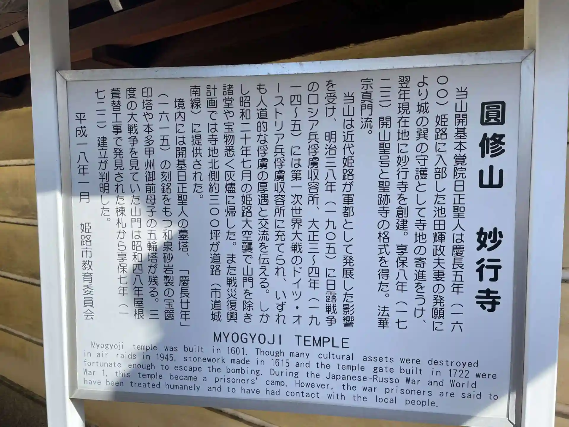 「当山開基覚院日正聖人は慶長5年(1600)姫路に入部した池田輝政夫妻の発願により城の巽の守護として寺地の寄進をうけ 翌年現在地に妙行寺を創建。享保8年(1723)開山聖号と聖跡寺の格式を得た。法華宗真門流。・・・・・」