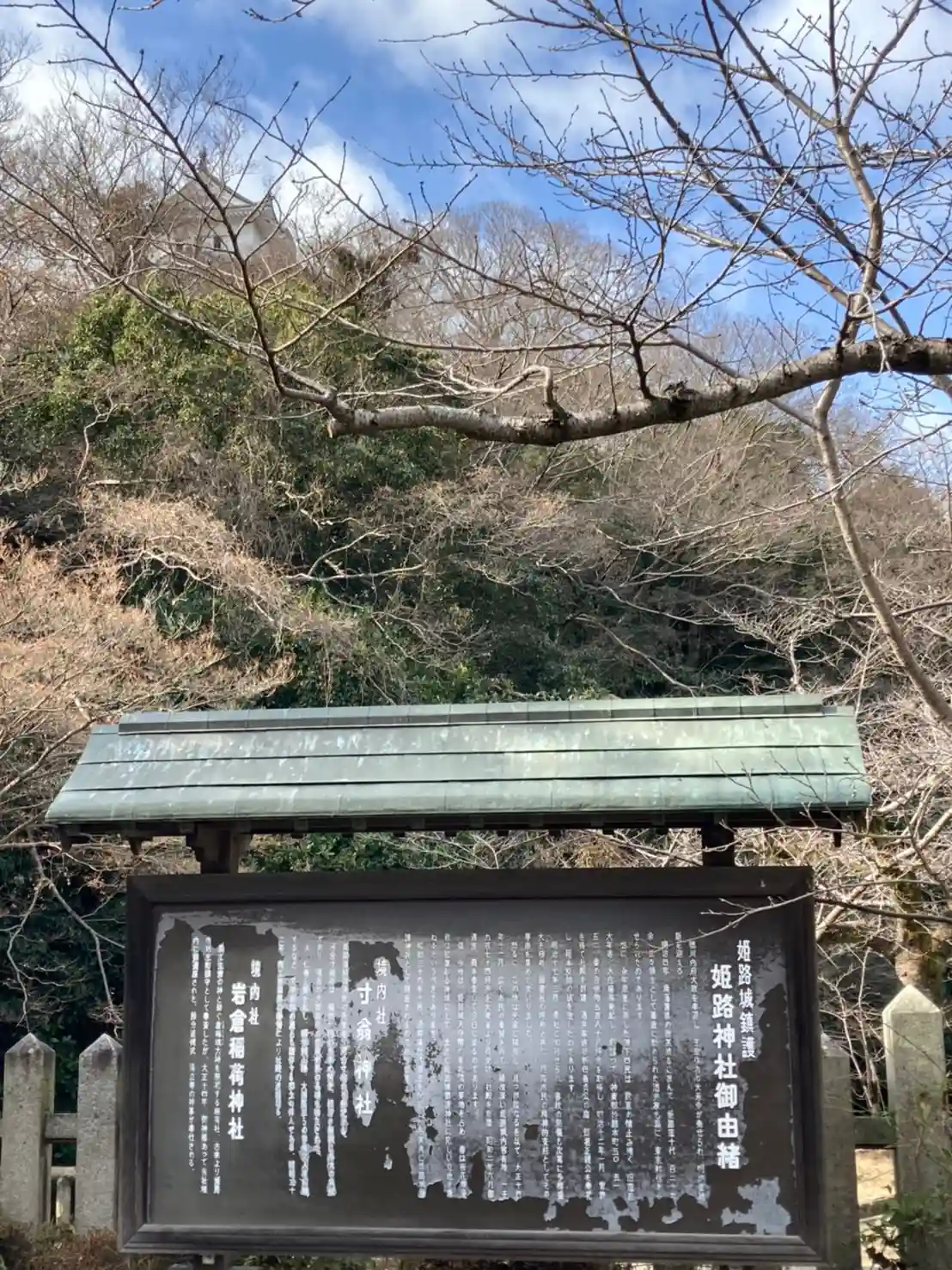 天守閣からは鬼門である艮の方角に当たりましが、旧社域が狭隘だったため、大正14年(1925年)11月、現在地に当たる姫路城内の官有地1974坪余を大蔵省から買い受け社殿を新築し、昭和2年(1927年)6月に遷座されまた。昭和36年(1961年)10月には酒井家歴代藩主が合祀されています。