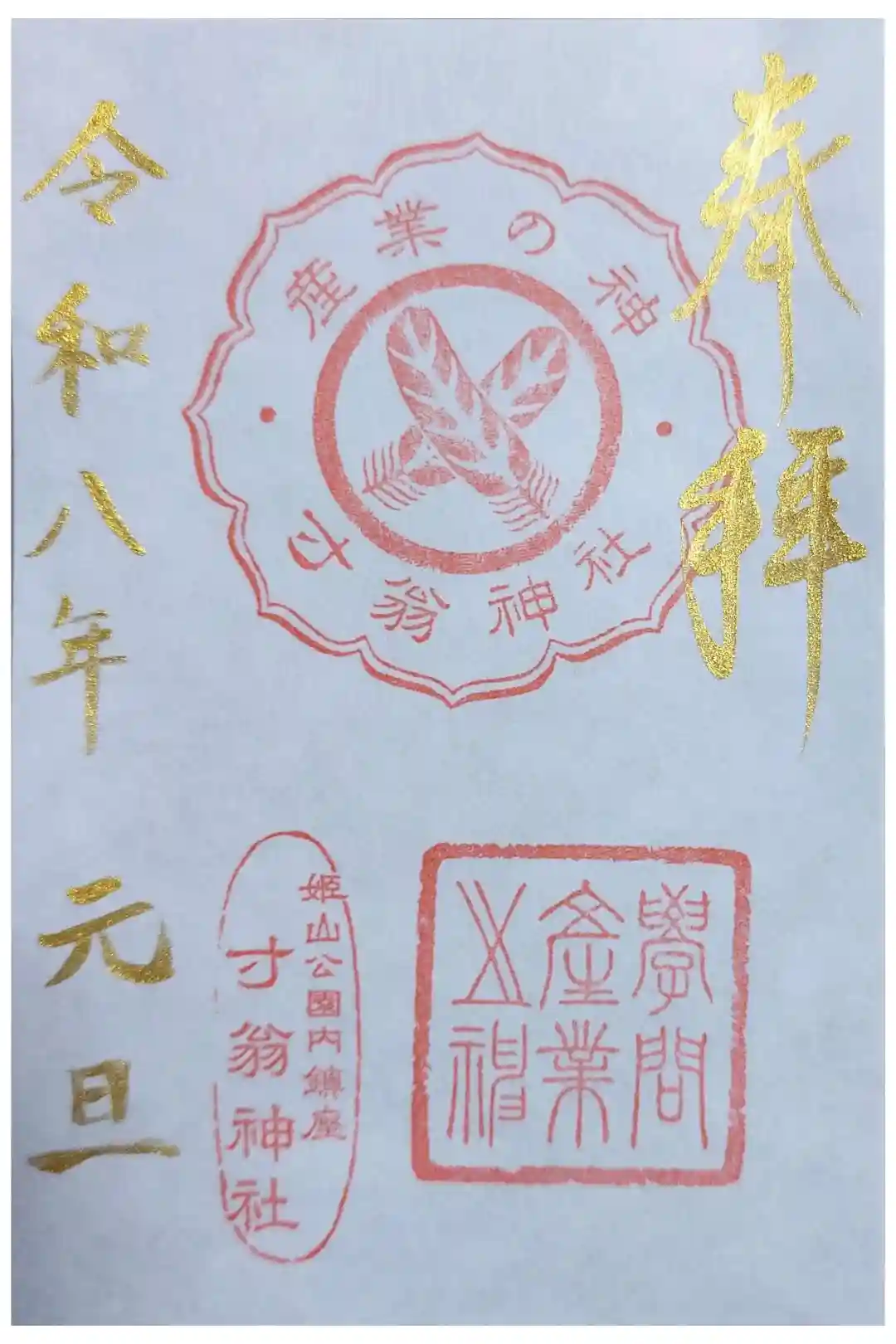 右に「奉拝」の文字、左に「令和二年文月十八日」と日付が書かれています。真ん中に「産業の神寸扇神社」、「姫山公園内鎮座寸扇神社」などの朱印が全部で三つ押されています。