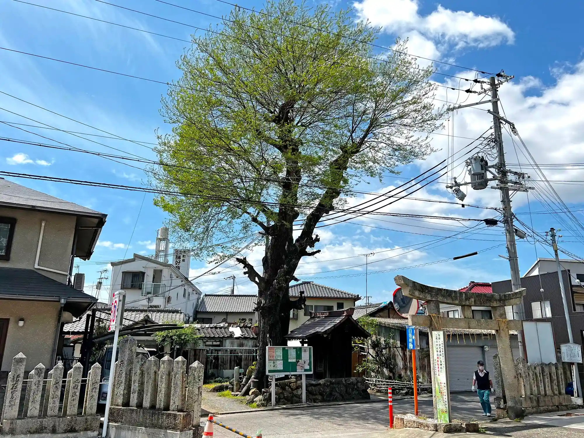 一の鳥居まで戻る。一の鳥居の背後には表札のない小さな社と、その横に高い古木が立っている。