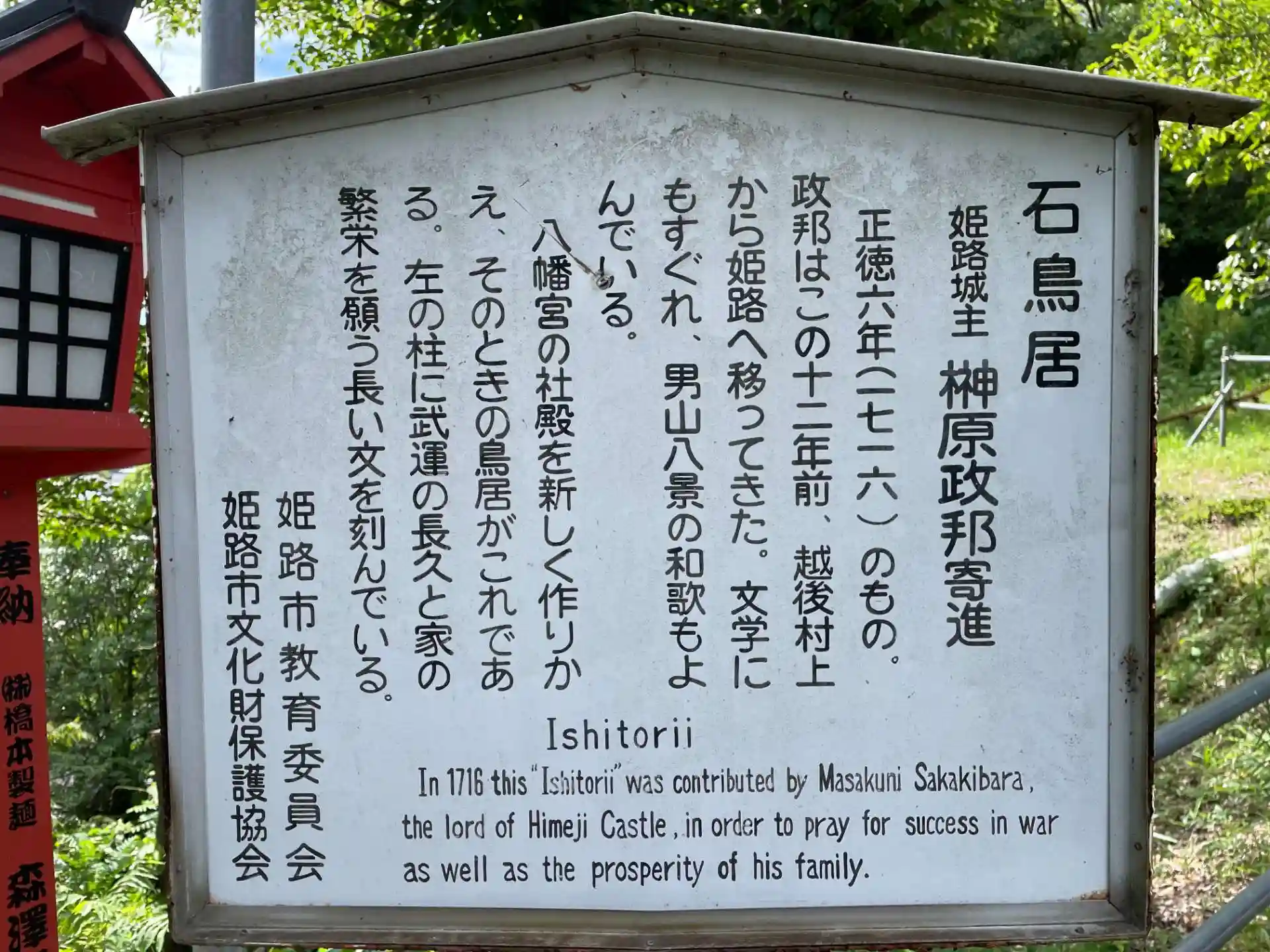 1716年(正徳6年) 榊原政邦が社殿を新築再建した。社殿の前に現在残っている石鳥居はこの時に寄進された物で武運長久・家門繁栄を願った文章が刻まれている。