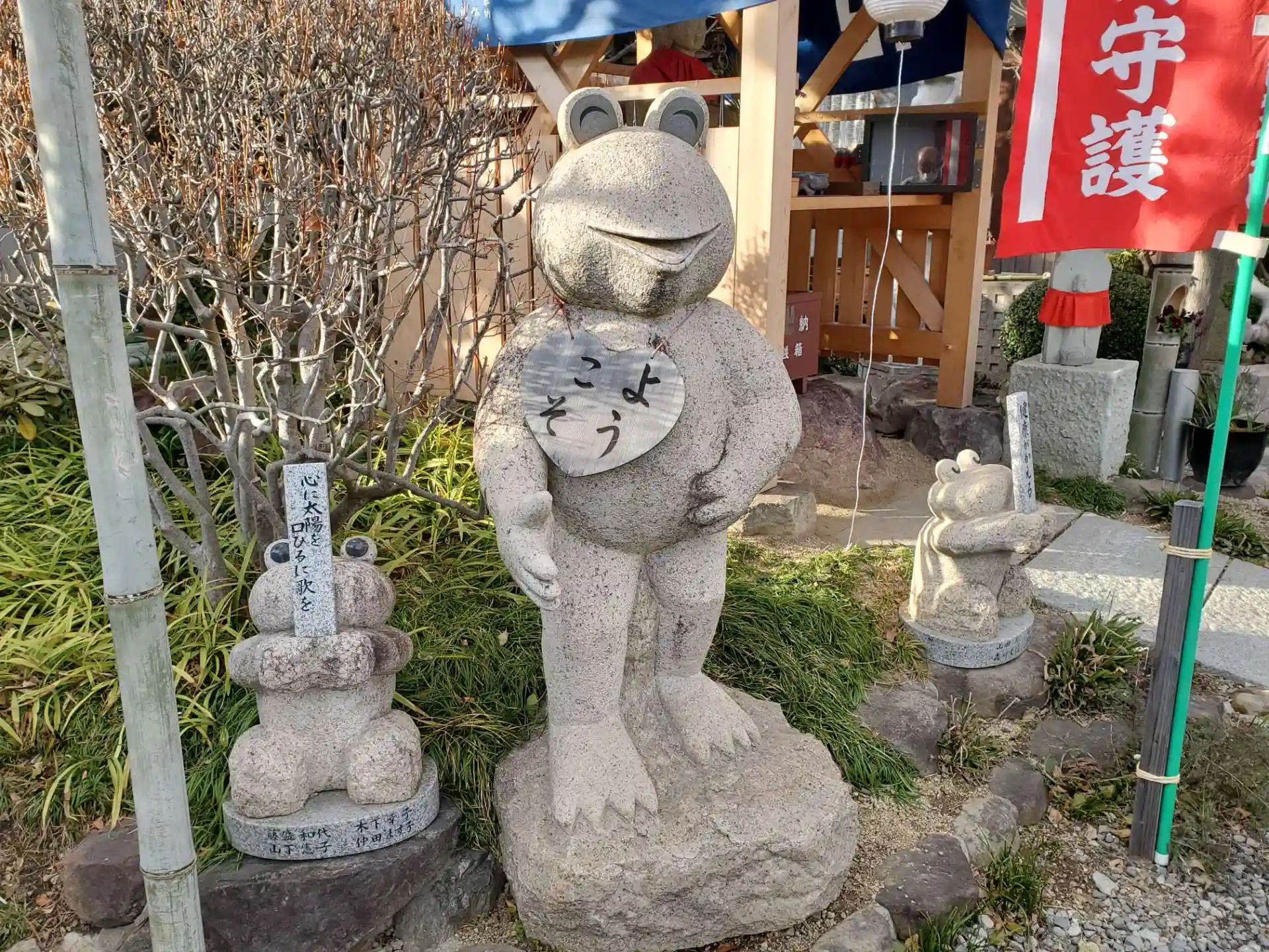 「カエル寺」とも呼ばれるだけあって、境内には様々なカエルの置物や石造がたくさんありました。
