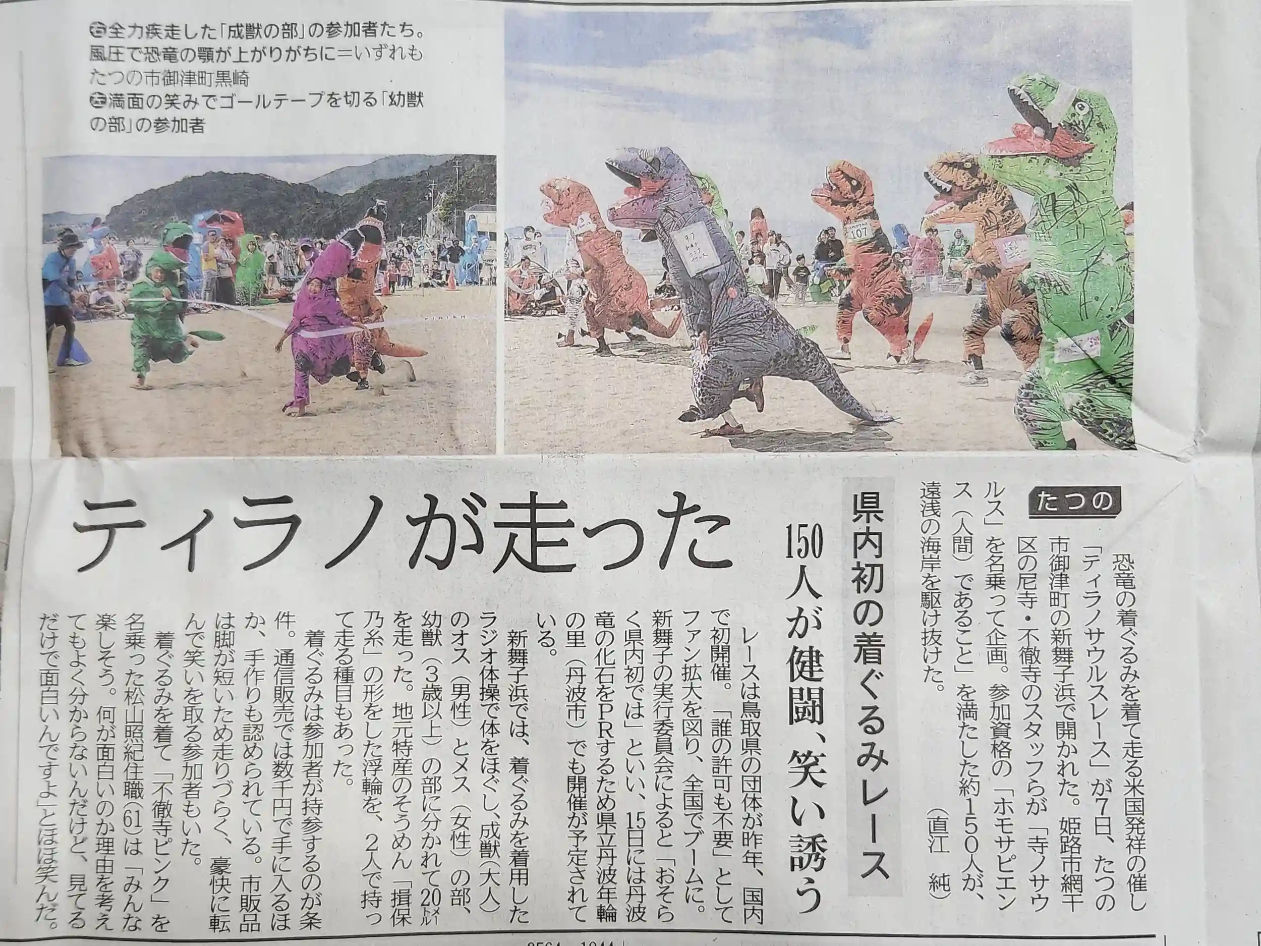 なんとこのティラノサウルスレースは、恐竜の着ぐるみを着て走るレースでたつの市で開かれたようなのですが、この企画をしたのが不徹寺を含むスタッフ「寺ノサウルス」だとか。