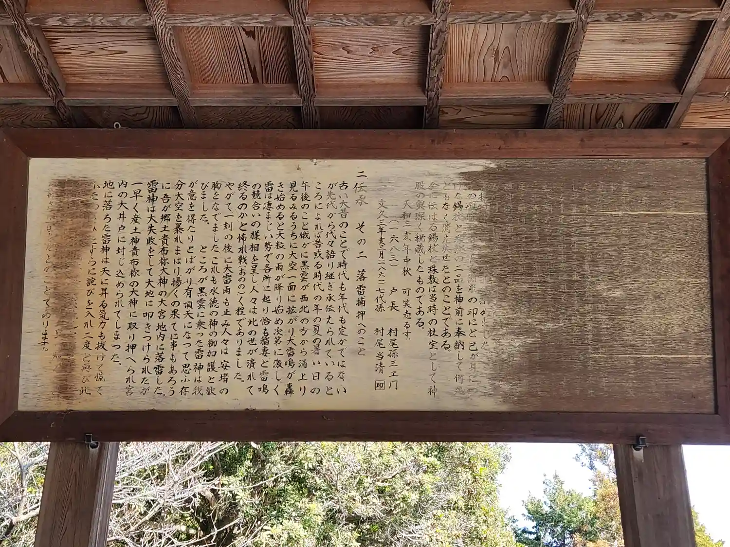 拝殿内にはこの地域に伝わる伝承が二つ書かれていましたが、一つ目はほぼ文字が読めず