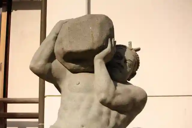 境内に石を担いだ三ノ宮卯之助の像。太ももは太いが上では細身で足は短い(笑)