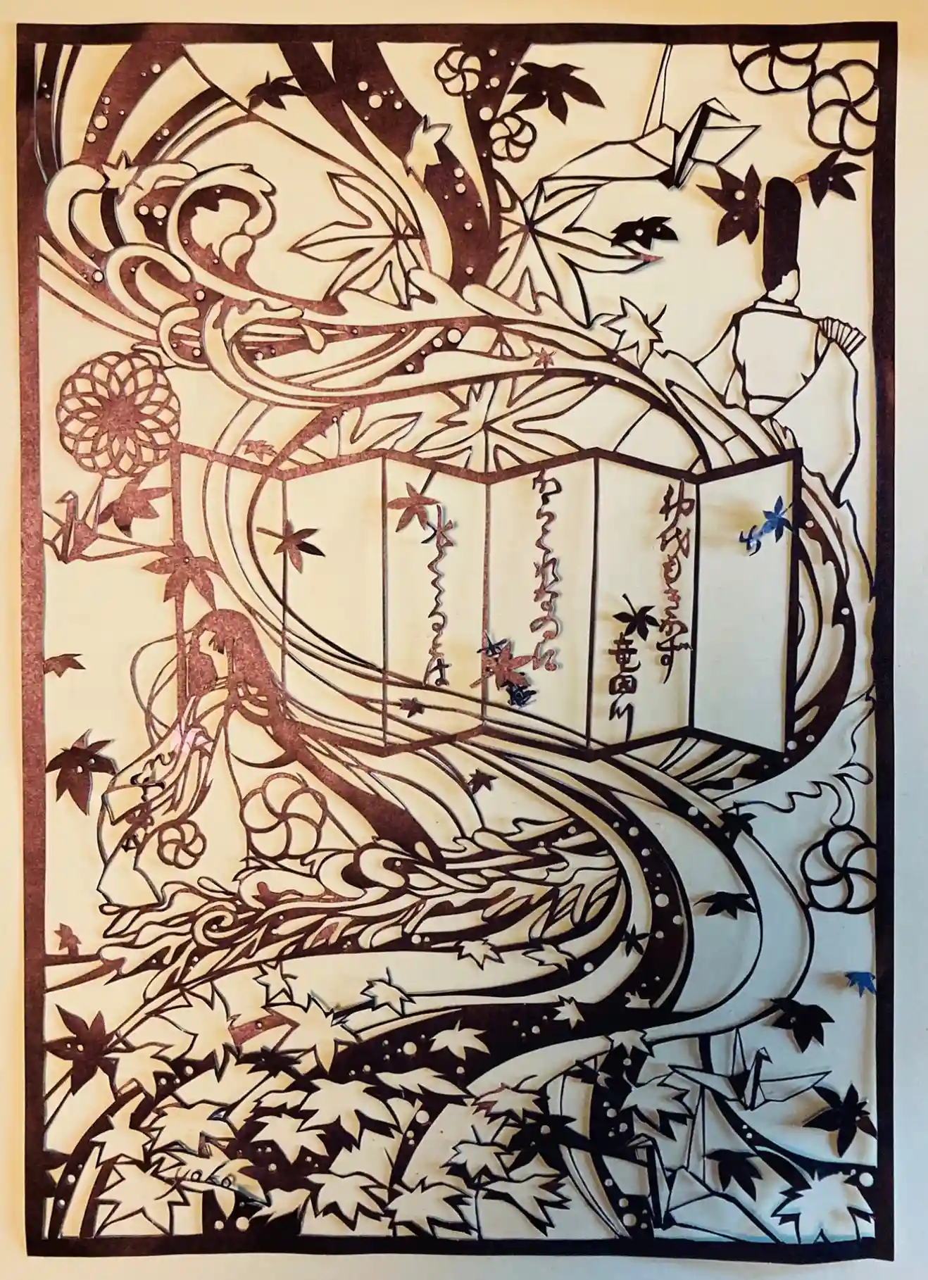 桜の花が咲く美しい季節。水辺に幕をはって敷き物をしき、若い女性が寝転んでいます。料理が入った重箱にも手をつけず、お花見もせず、一人きりで悩んでいるような様子です。 これは江戸時代の実際の事件にもとづいた物語を題材に描かれたものです。