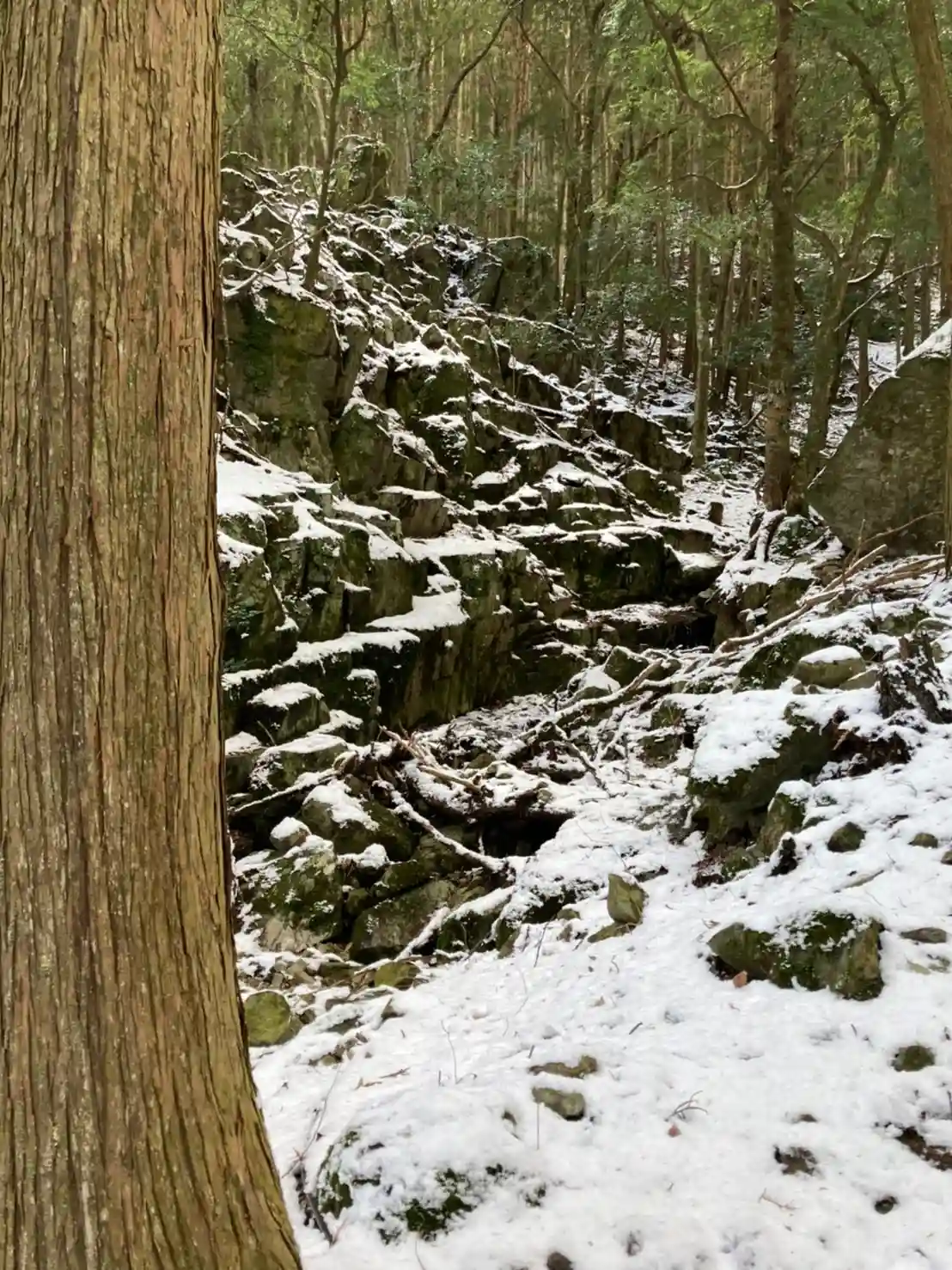 今回は枯落葉の上に積雪で、半分凍てついたお一方の足跡が続く厳しい階段に、万が一転んでどなたかにご迷惑をおかけしてはいけないと思い慎重に歩きました。