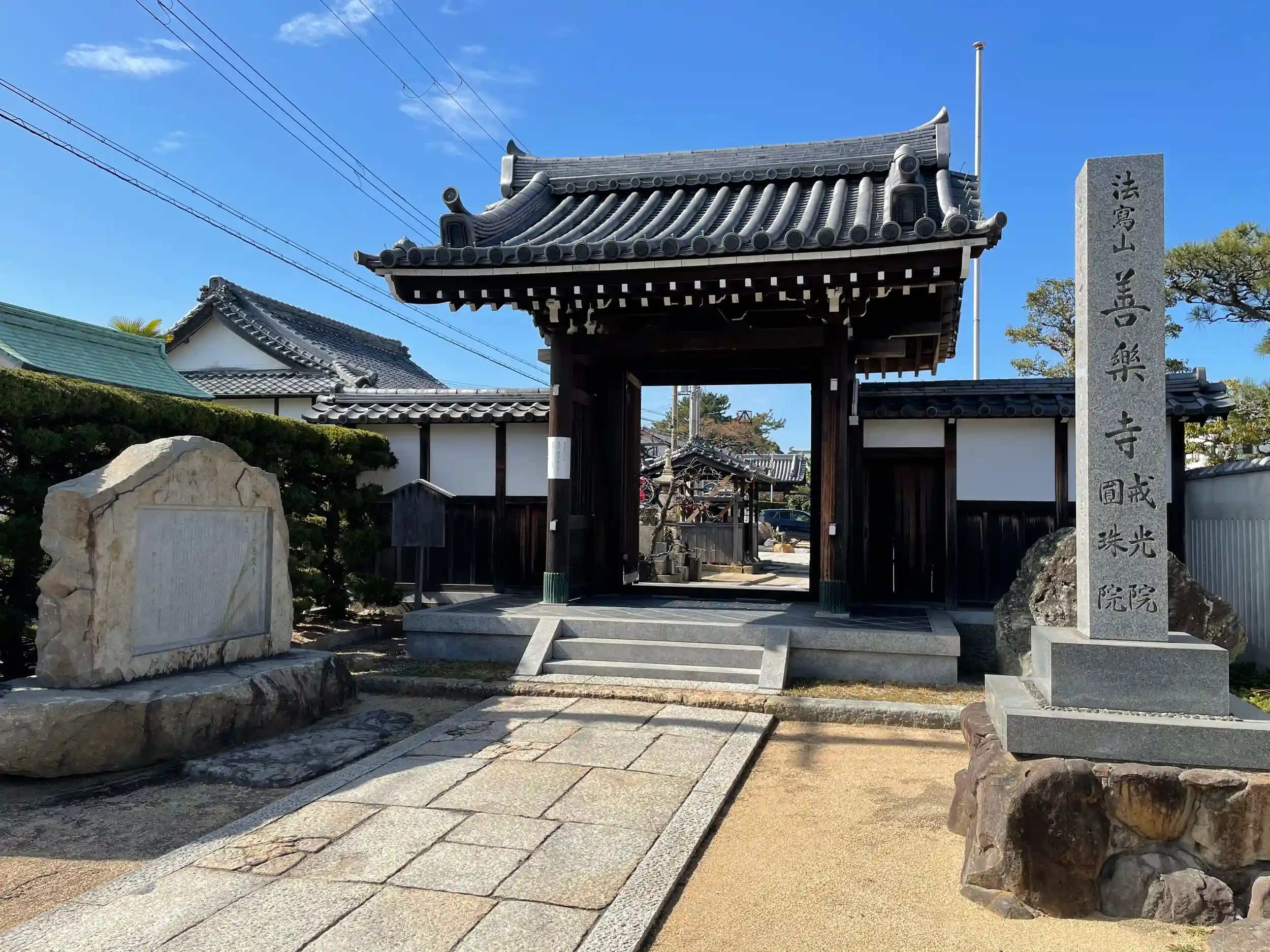 山門の横に由緒が書かれた石碑。「善楽寺 円珠院・戒光院」と書かれた石標があるが、円珠院は山門くぐってもない。