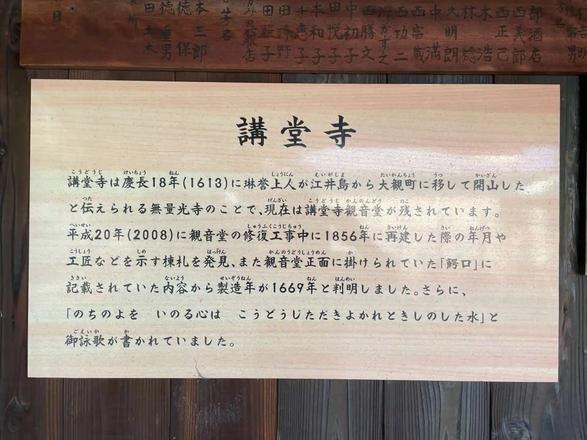 平成20年(2008)に観音堂の修復工事中に1856年に再建した際の年月や工匠などを示す棟札を発見 また観音堂正面に掛けられていた「鰐口」に記載されていた内容から製造年が1669年と判明しました。