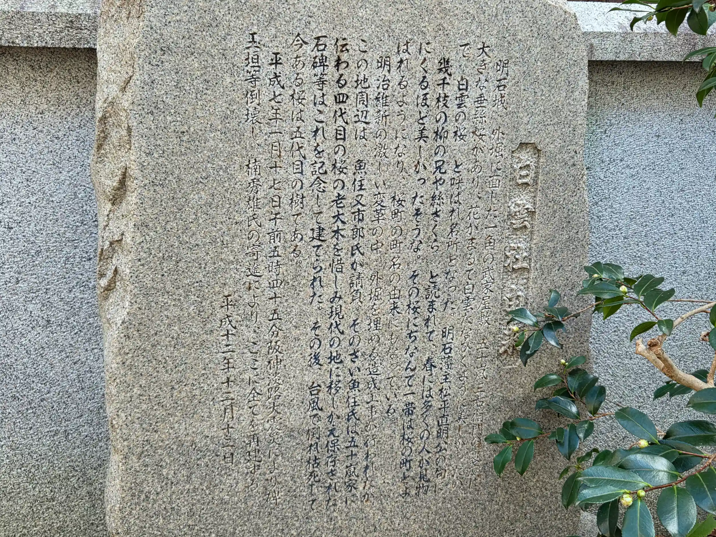 明石城 外堀に面した一角の武家屋敷、五十嵐三右衛門の裏庭に大きな垂絲桜があり、花がまるで白雲たなびくように美しかったので、白雲の桜と呼ばれ名所となった。