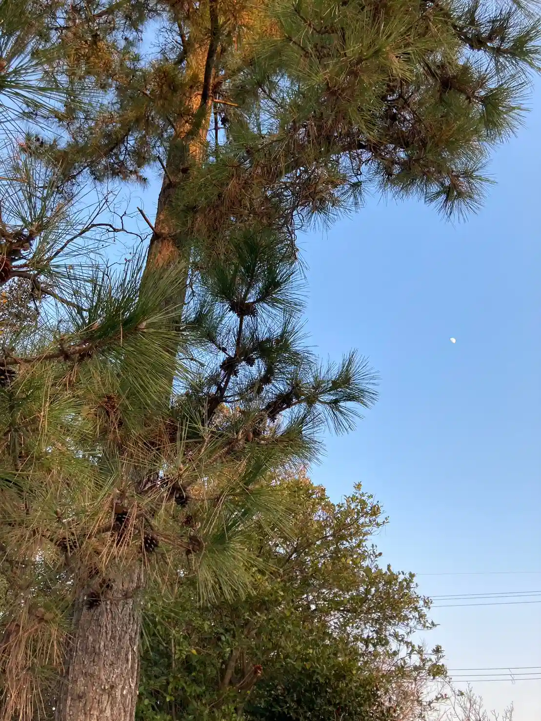 拝殿後方(北側)。立派な松の木が自由奔放に伸びている。このさらに北側は公園のような林。