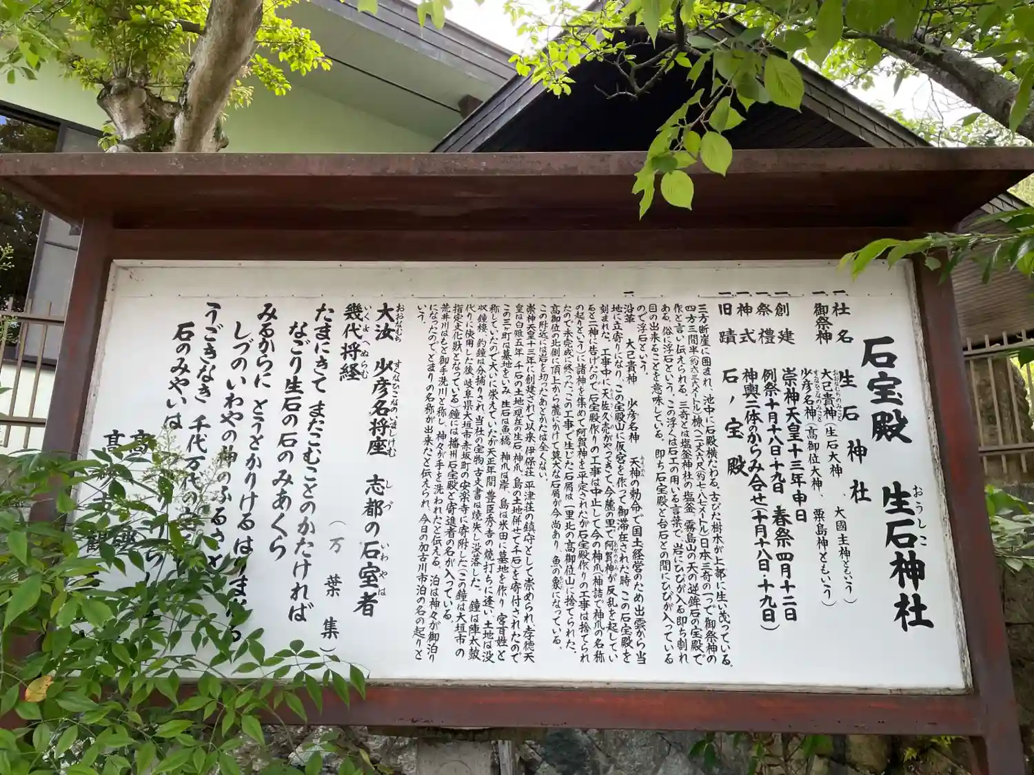 ご神体は浮いているように見える事から浮石とも言われる「石の宝殿」で、大穴牟遅と少毘古那の二柱が国家…