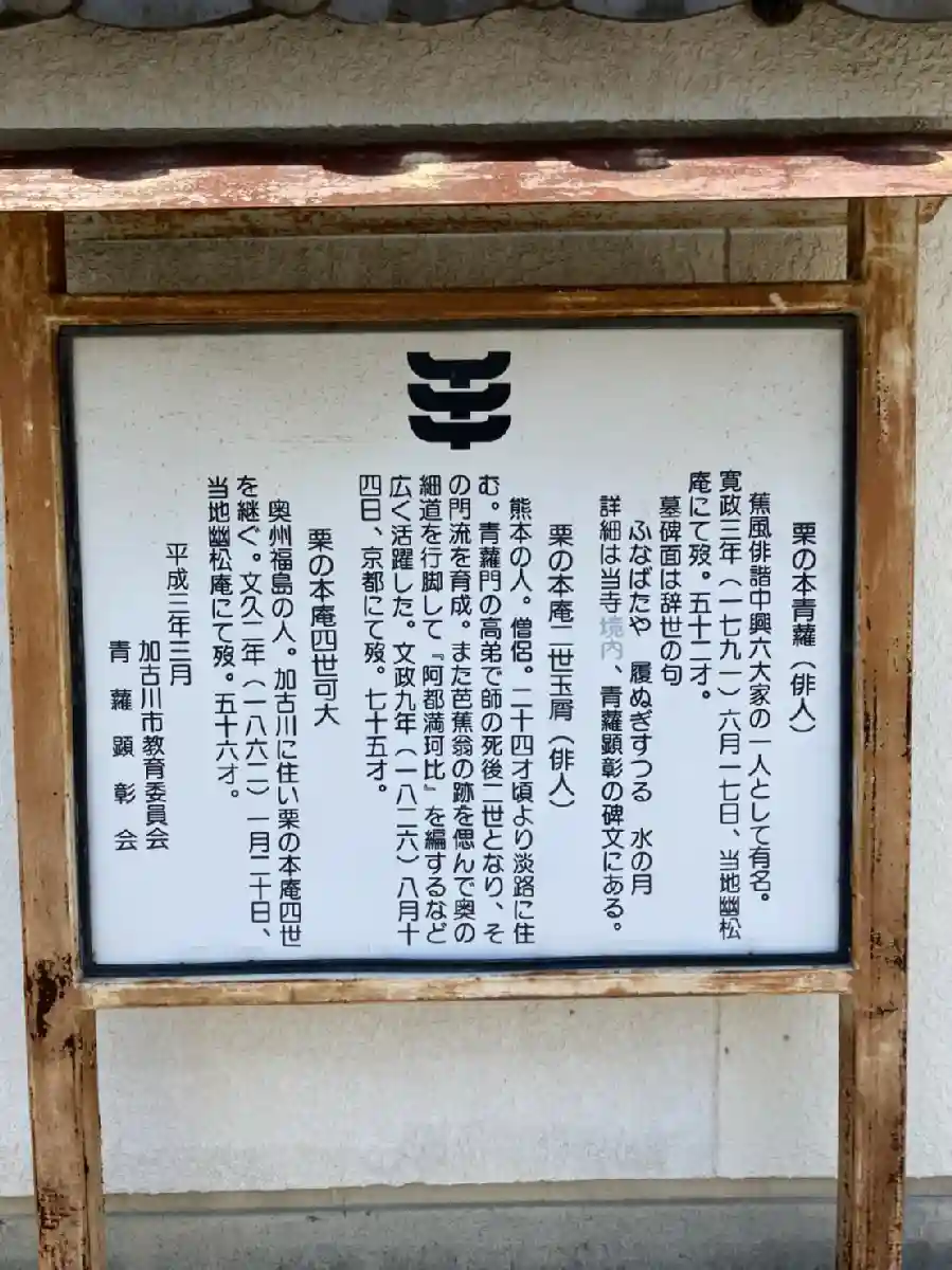 中興俳諧の名家として、蕪村らとともに名のあげられている青蘿は寺家町に住んだ俳人です。