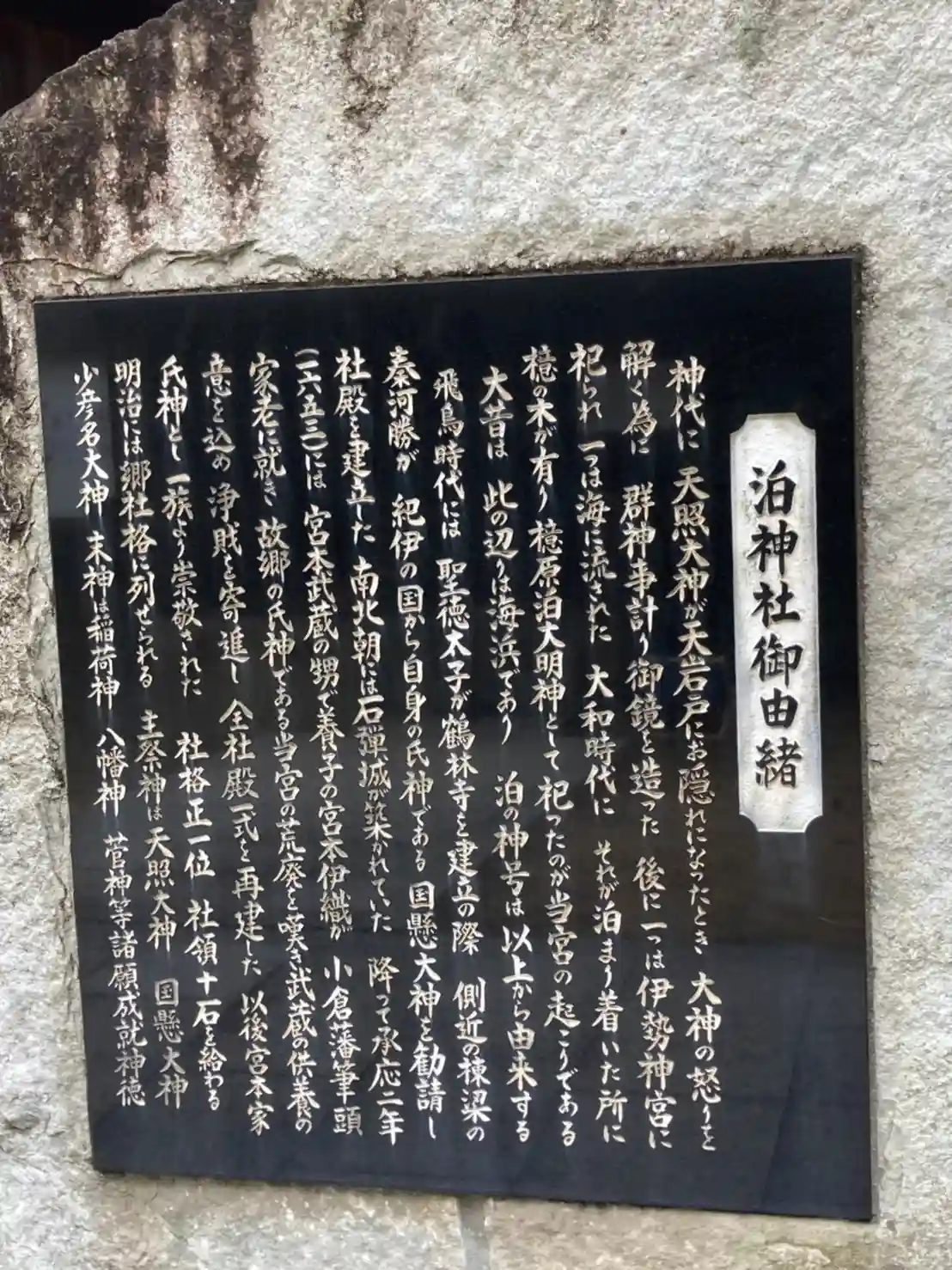 神代に伊勢神宮の御神体の一つである御鏡がここに泊まり着いたことから泊神社が起こったといわれています。