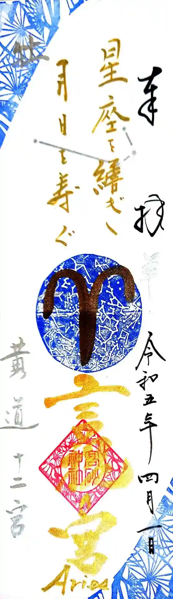 高砂神社の2023年4月の縁の宮御朱印「白羊宮」と言祝御朱印「山羊座」です。