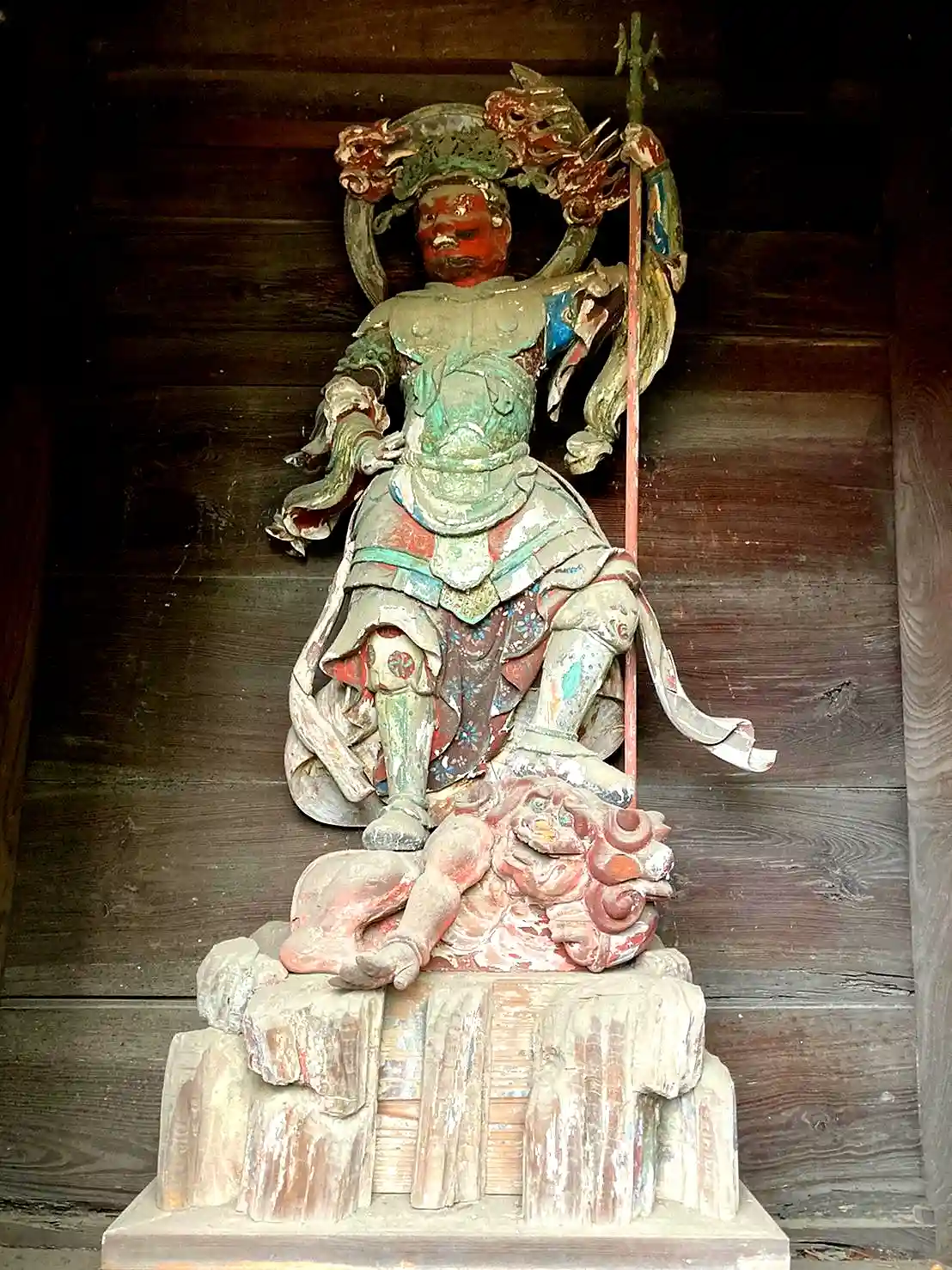 左手を腰にあて右手に三鈷を握って振りかざしておられ、四天王とも足下に邪鬼を踏まえて、御本尊を四方から囲んで配されます。