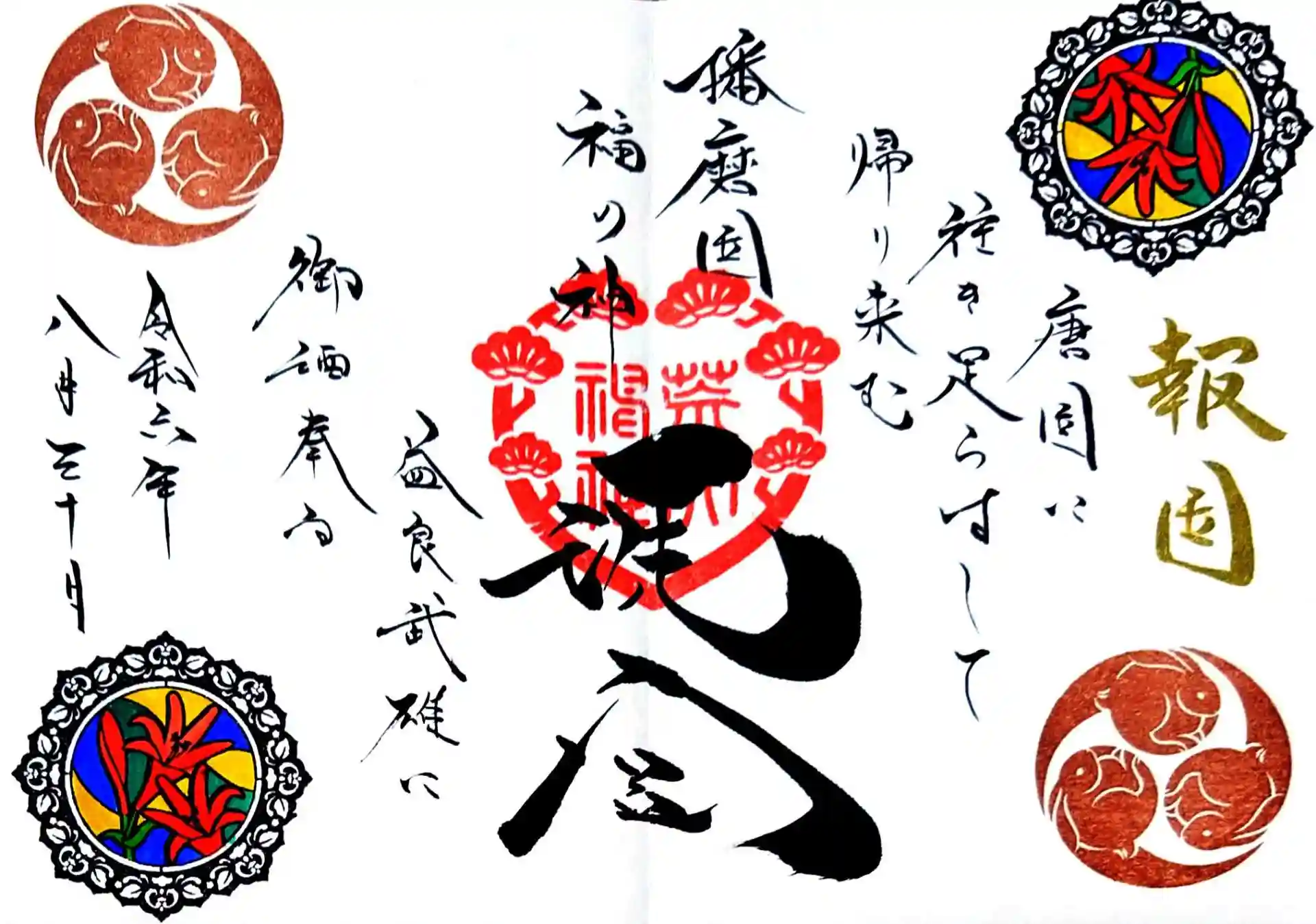 荒井神社の2024年8月の洗心御朱印と報国の和歌御朱印です。