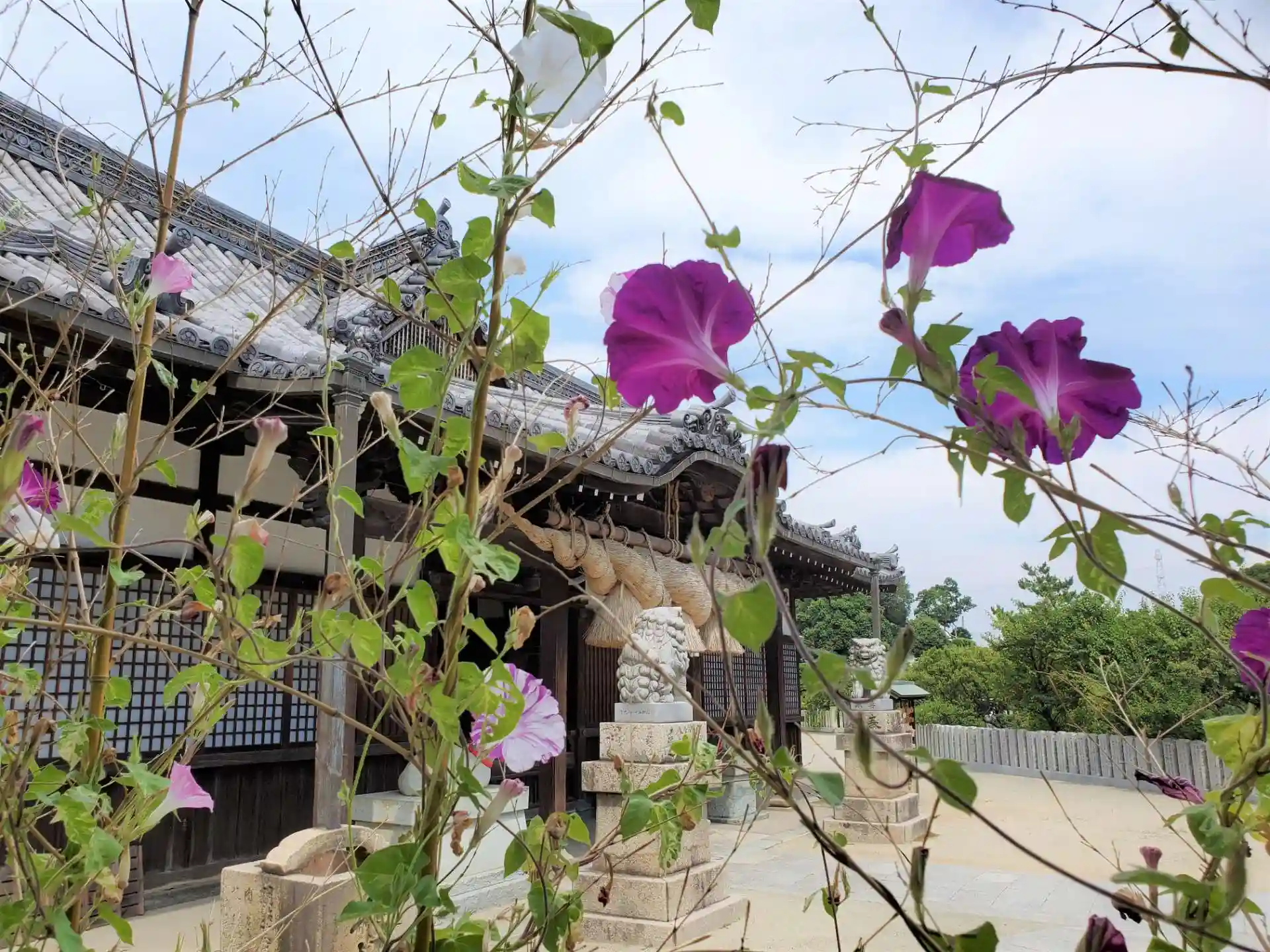 朝顔越しに見た拝殿