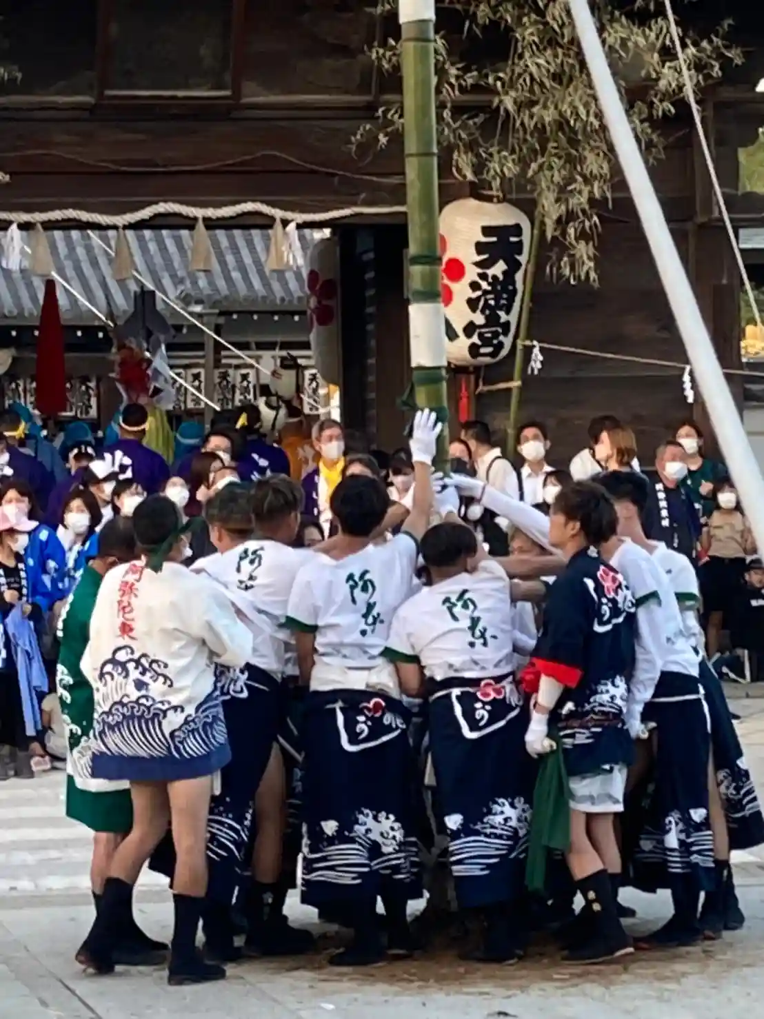 曽根天満宮境内では、のぼりの付いた竹を地面に激しく叩き付ける「竹割り」、「一ツ物神事」「お面掛け」など内容盛りだくさんです。