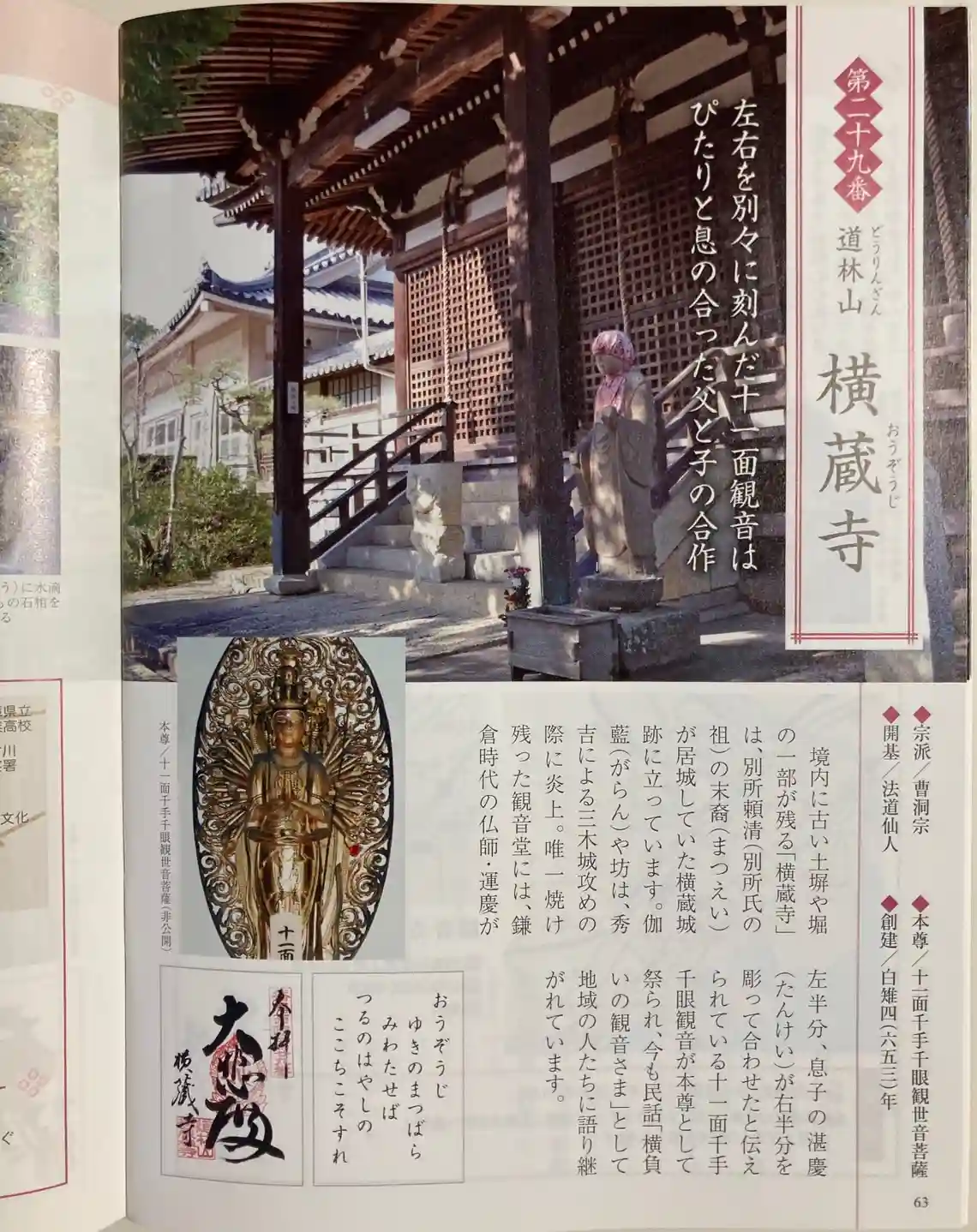 唯一残った観音堂には、鎌倉時代からの仏師・運慶が左半分、息子の湛慶(たんけい)が右半分を彫って合わせたと伝えられている十一面千手千眼観世音菩薩が本尊として祭られ、今も民話「横負いの観音さま」として地域の人たちに語り継がれています。