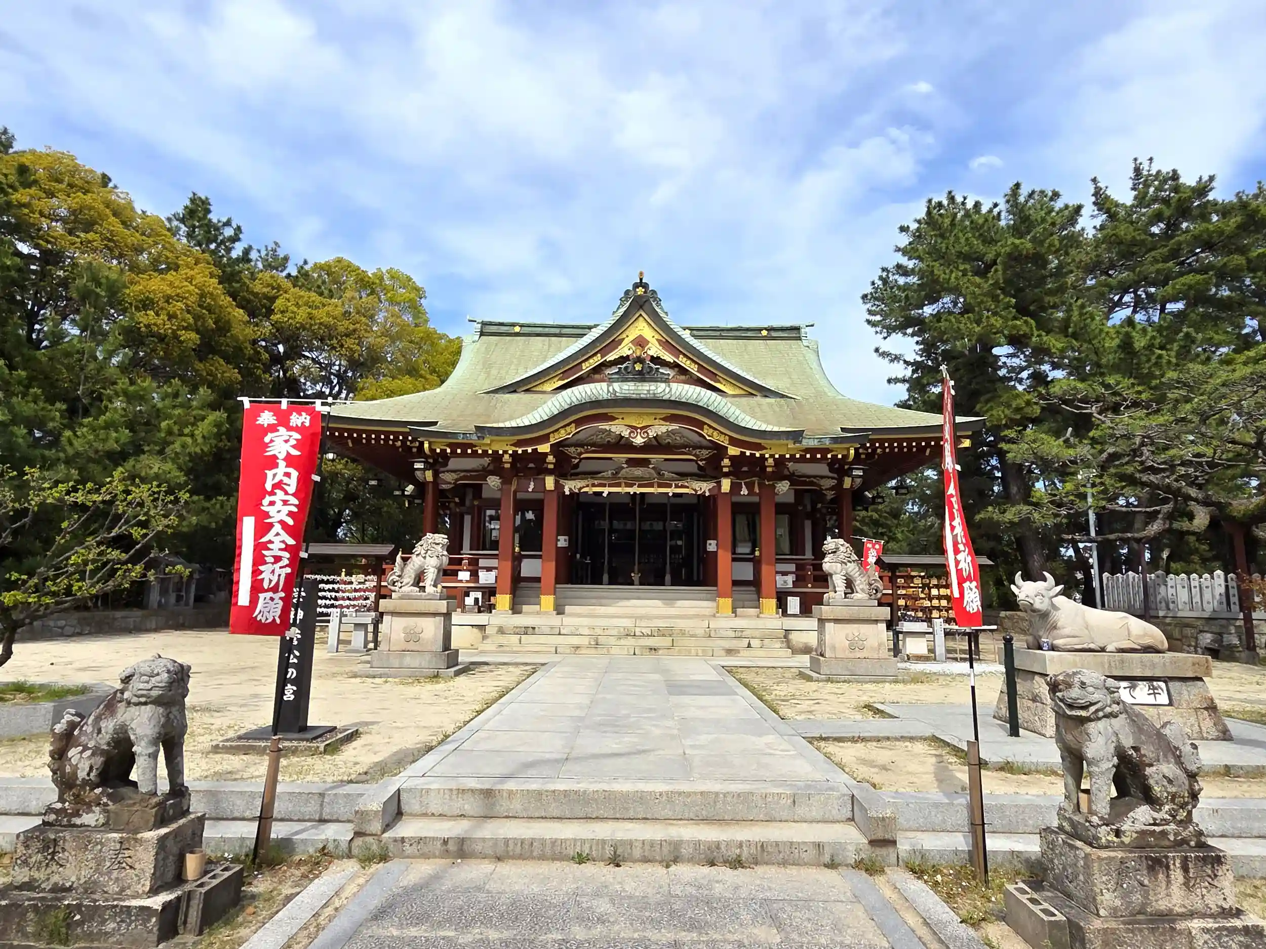 拝殿前には二対の狛犬さんとなで牛