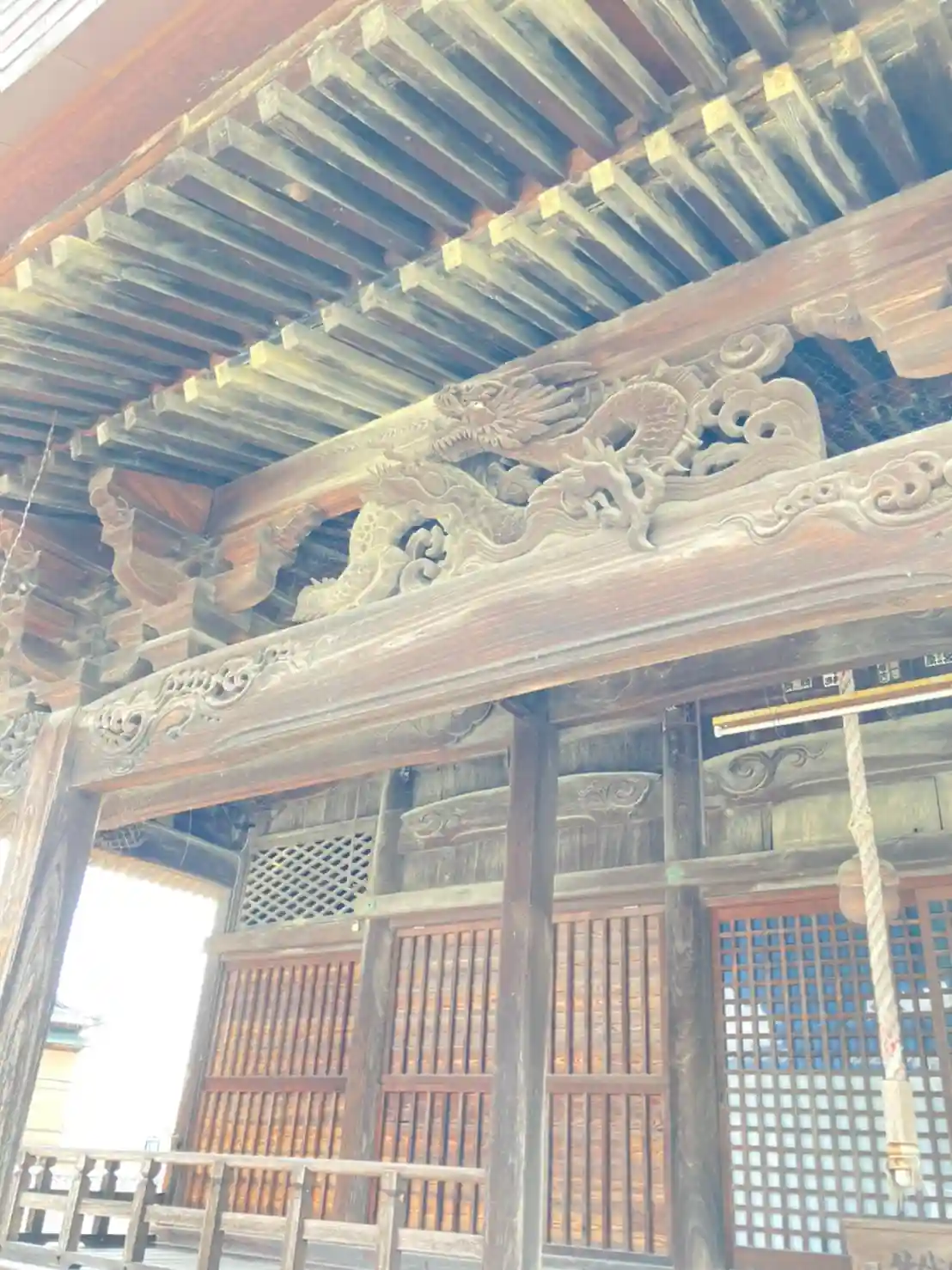 <本堂>正面。扁額はない。簡素な彫刻でシンプルな造り。