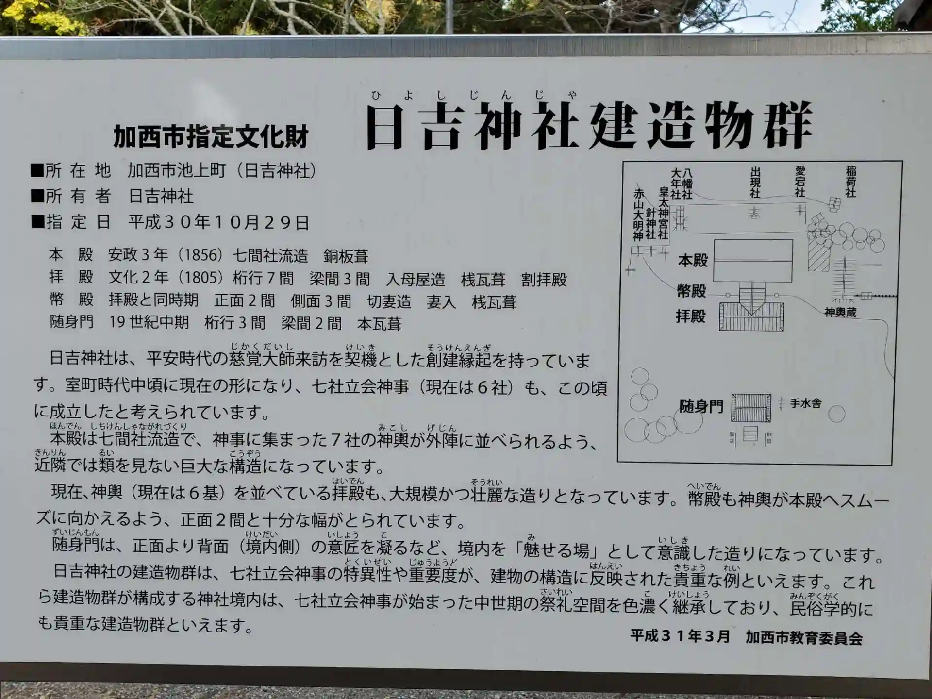 太古の昔、加西市北部の鎌倉山を御神体として崇めていたそうで、その大神様を里にお迎えし、今から約1300年前に近江国日吉社(滋賀県大津市日吉大社)より御分霊をいただいたとあります。