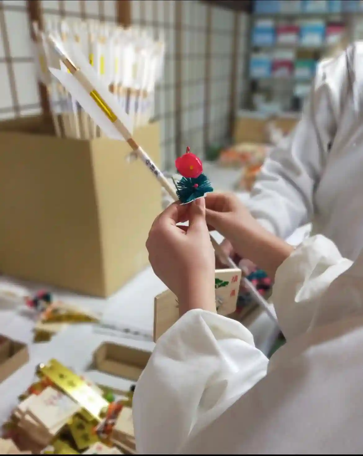 大宮八幡宮では絵馬矢を、巫女・神社職員が、一体一体心をこめて奉製させていただいております。