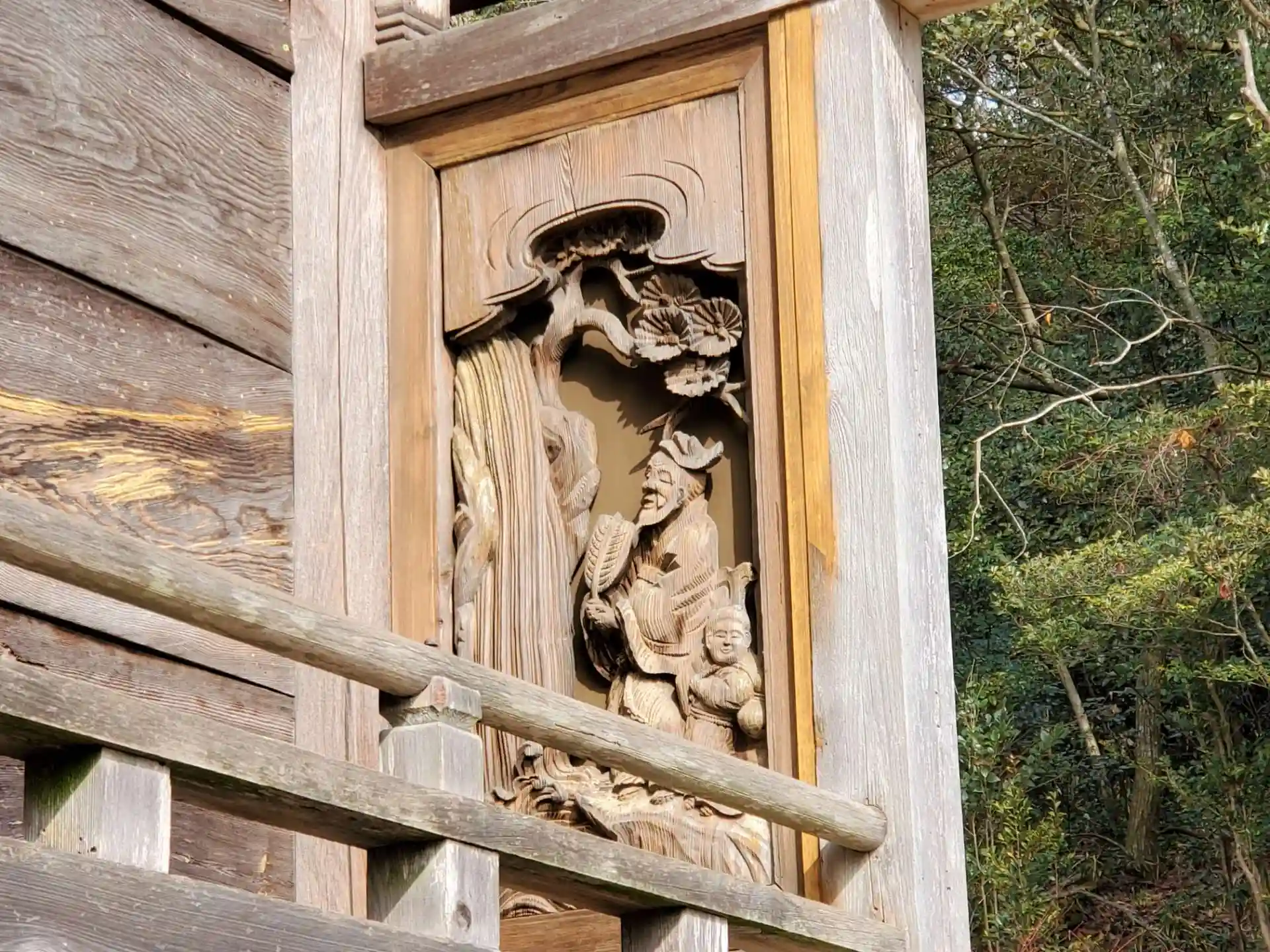 右側の本殿から見た拝殿後方の彫刻