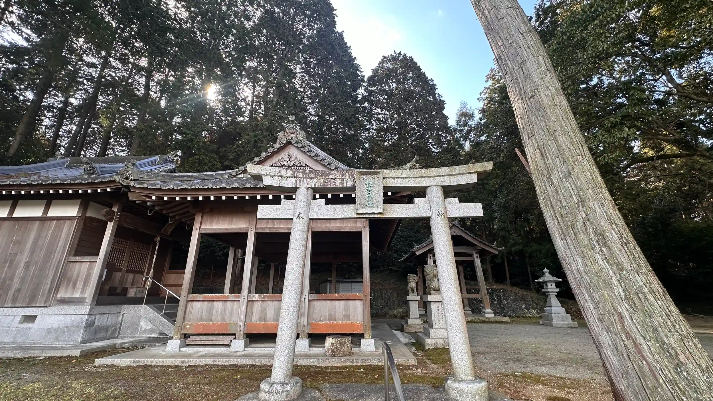 創建 慶応2年(1866)。社号票、扁額には「本宮 住吉神社」とありますが、これしかご由緒は分かりません 山田川の川上にあたる「大上」と「船付」との中間位の小さな集落に鎮座されています、広くはないですが鎮守の森も手入れされているようで、しっかりと日差しが感じられました。