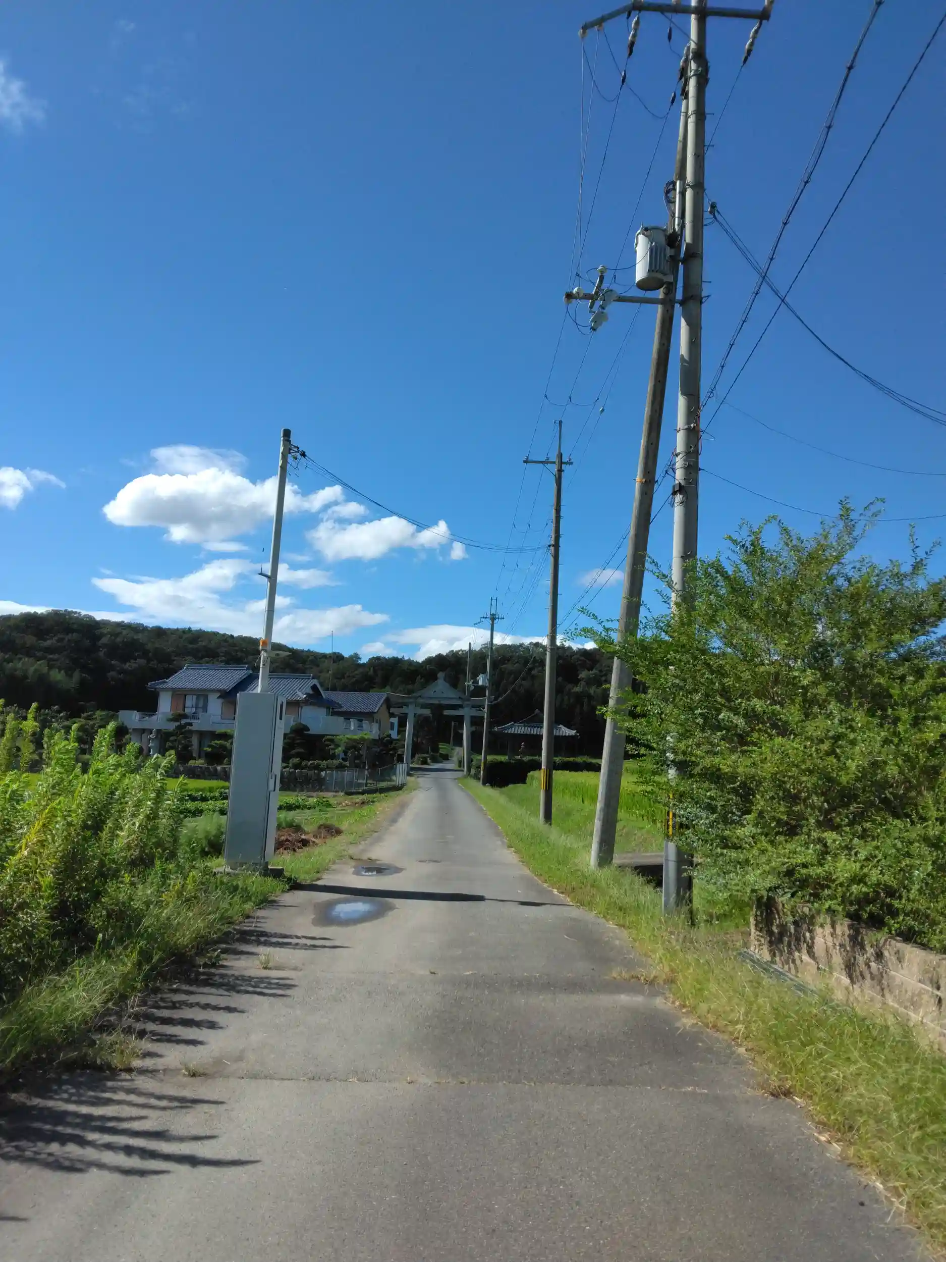 加東市厚利の県道小野藍本線から真っ直ぐに山側に続く道、そして目に入るのが普通の石鳥居の上に三角形の屋根のような形がのっている鳥居です。こちらが山王神社の鳥居で、先に社殿を見ることができます。