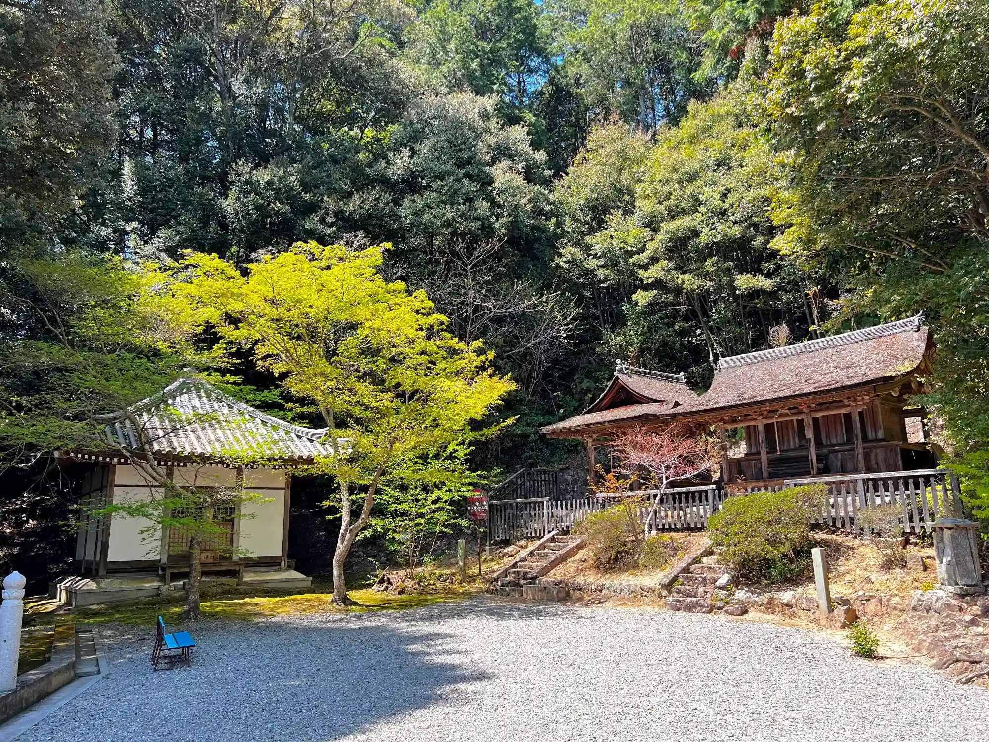 当寺は、北条鉄道・播磨下里駅の南西4kmの丘陵地帯の中にある。大通り(県道717号線)に面した境内南端から入り、一段上がると常行堂、もう一段上がると国宝・三重塔があり、さらに一段上がると金堂がある。さらに裏手(北側)には開山堂があり、金堂周辺にも見どころがあるので、一通り見て廻るにはたっぷりと時間が必要。小山を半分見て廻る感じ。